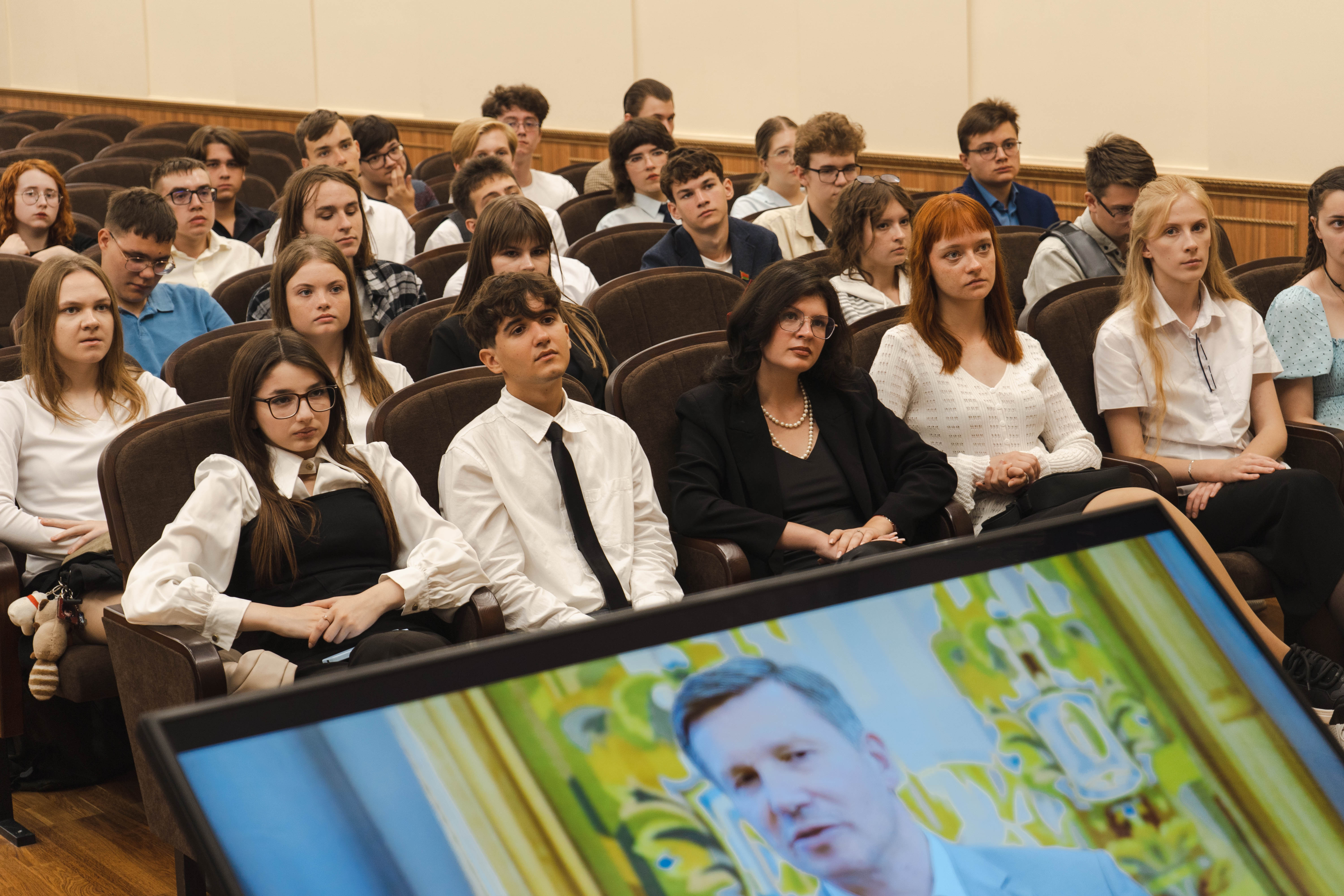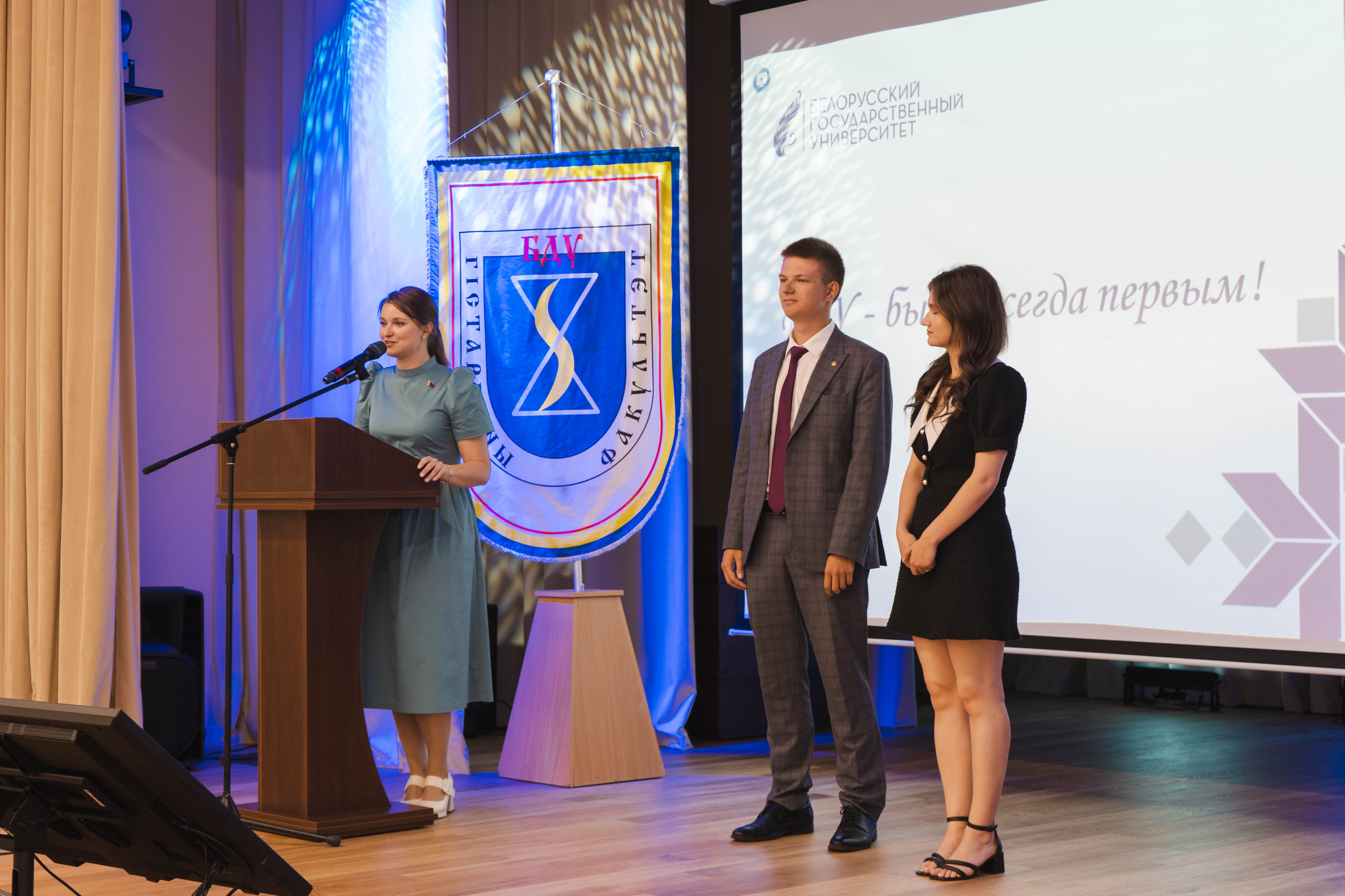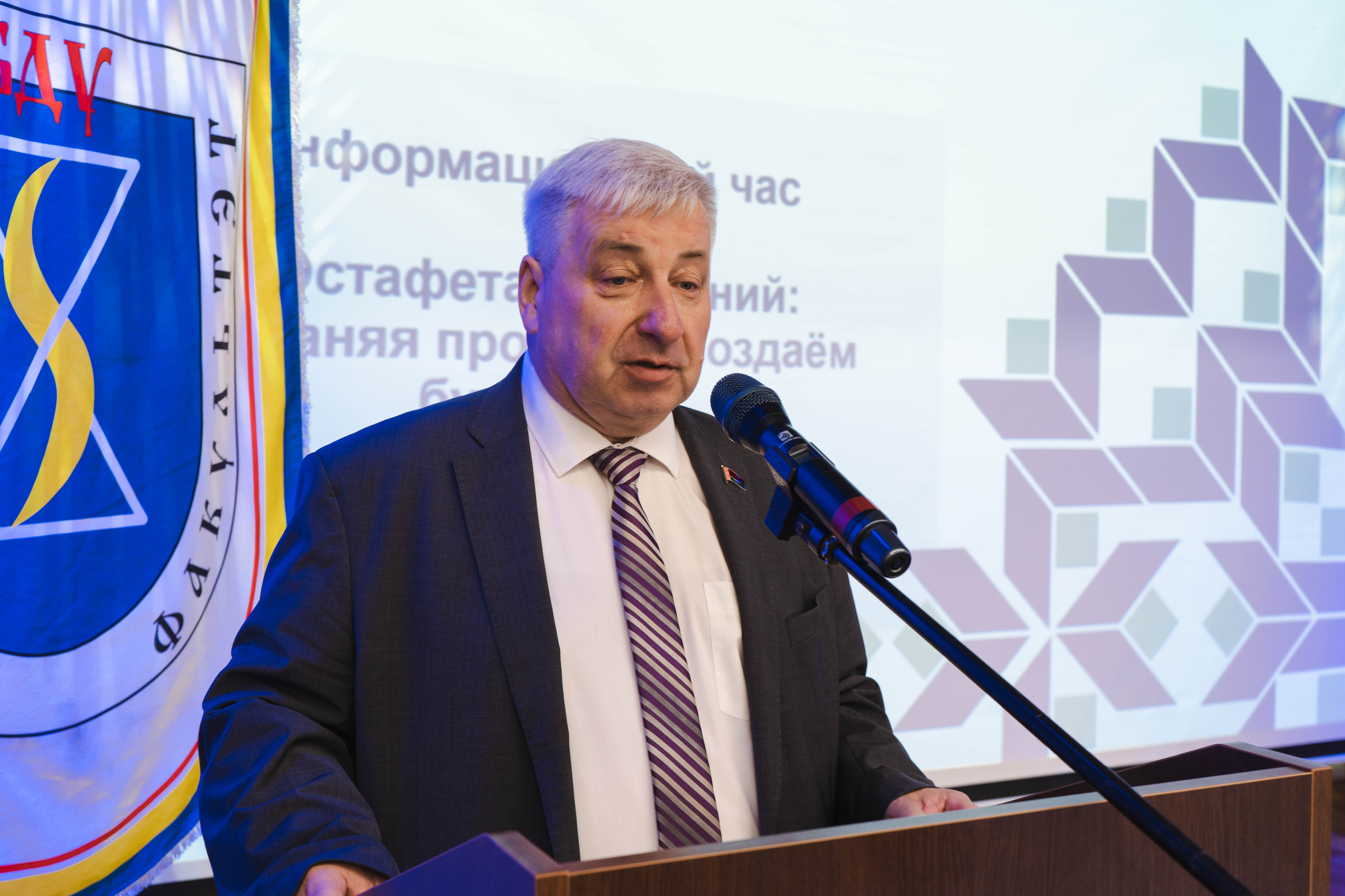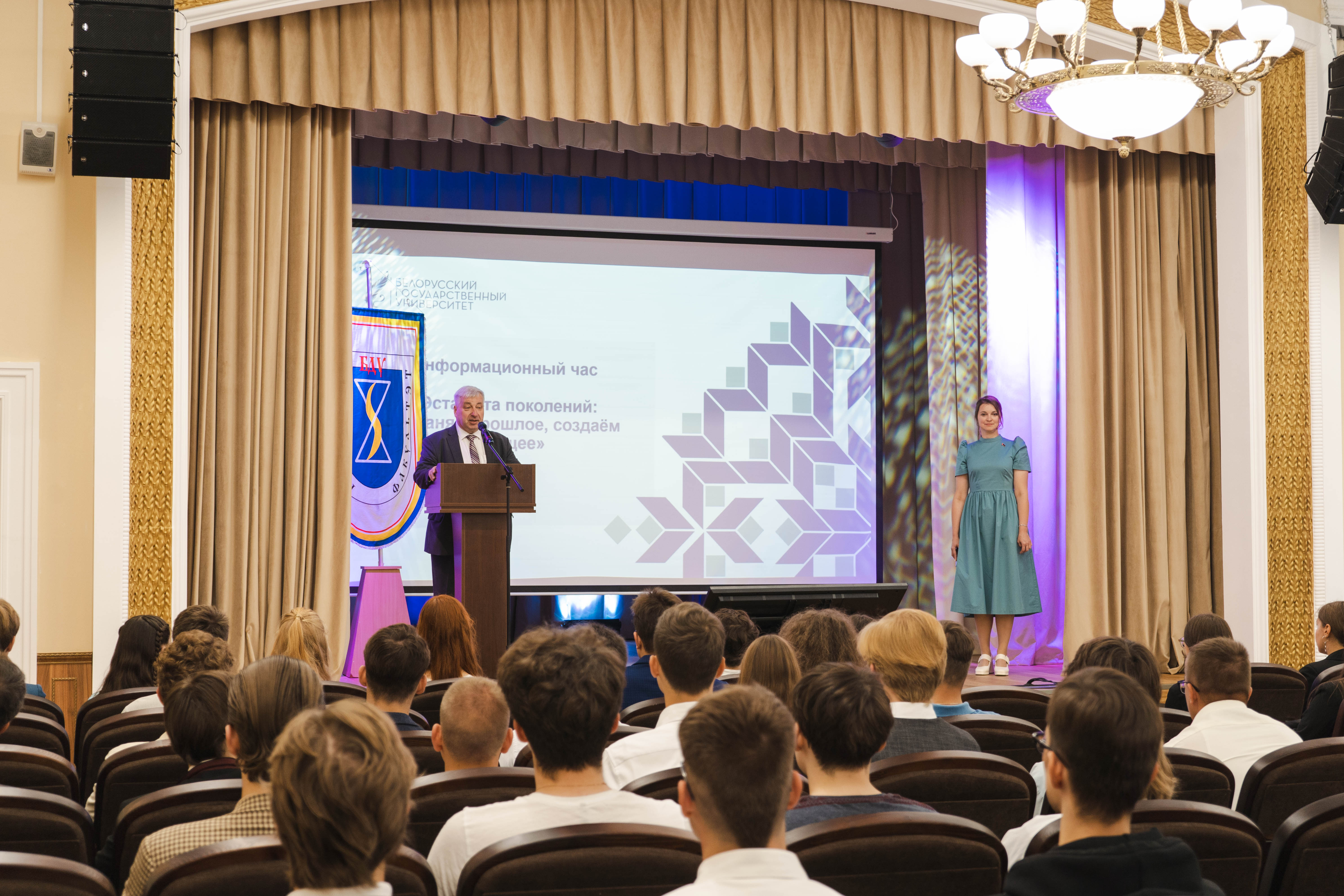 Описание изображения: Первый день нового учебного года стартовал встречей декана исторического факультета БГУ Александра Кохановского с первокурсниками. На информационном часе «Эстафета поколений: сохраняя прошлое, создаем будущее» декан поздравил всех с Днём знаний, рассказал о достижениях Беларуси за последние годы и роли БГУ в развитии нашей страны. Из уст декана первокурсники узнали, в чем уникальность БГУ, о достижениях университета, его истории, малоизвестных фактах за более чем столетний период развития alma matter. — Все, что мне дорого, что я ценю и люблю — в основе всего наш Университет. Призываю и вас ценить и любить alma matter,— резюмировал свое выступление декан. Далее эстафету подхватила заместитель декана по идеологической и воспитательной работе Алина Веремейчик. Она поделилась с первокурсниками информацией о возможностях, которые предоставляет сегодня университет каждому студенту, познакомила с активом студенческих организаций.