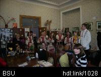 Описание изображения: | Студенты филфака БГУ перед приближающимися рождественскими праздниками и зимней сессией прошлись с калядной звездой по кафедрам и выступили перед преподавателями с величальными песнями, содержащими магические заклинания, пожелания благополучия, а также требования подарков и хороших отметок. |