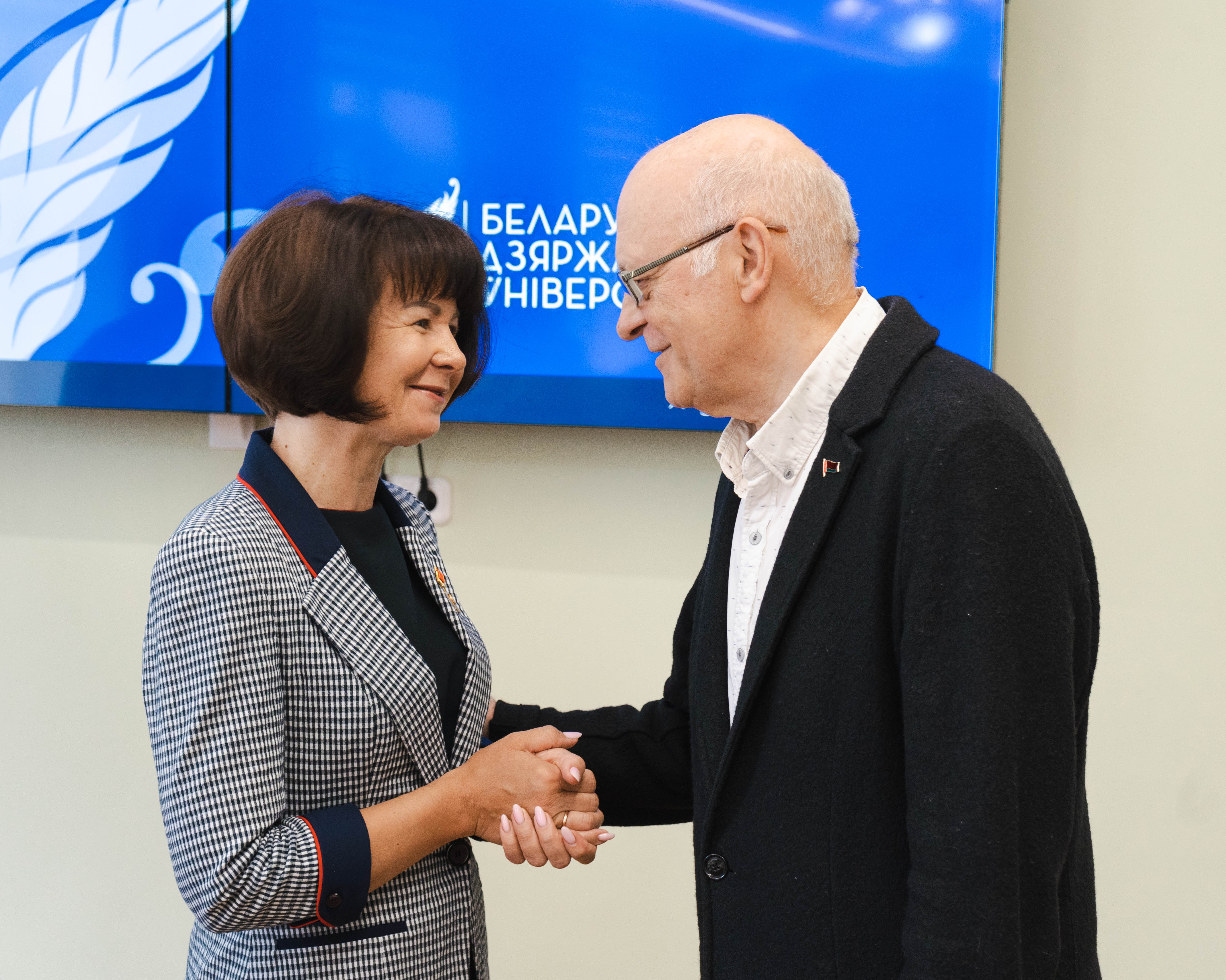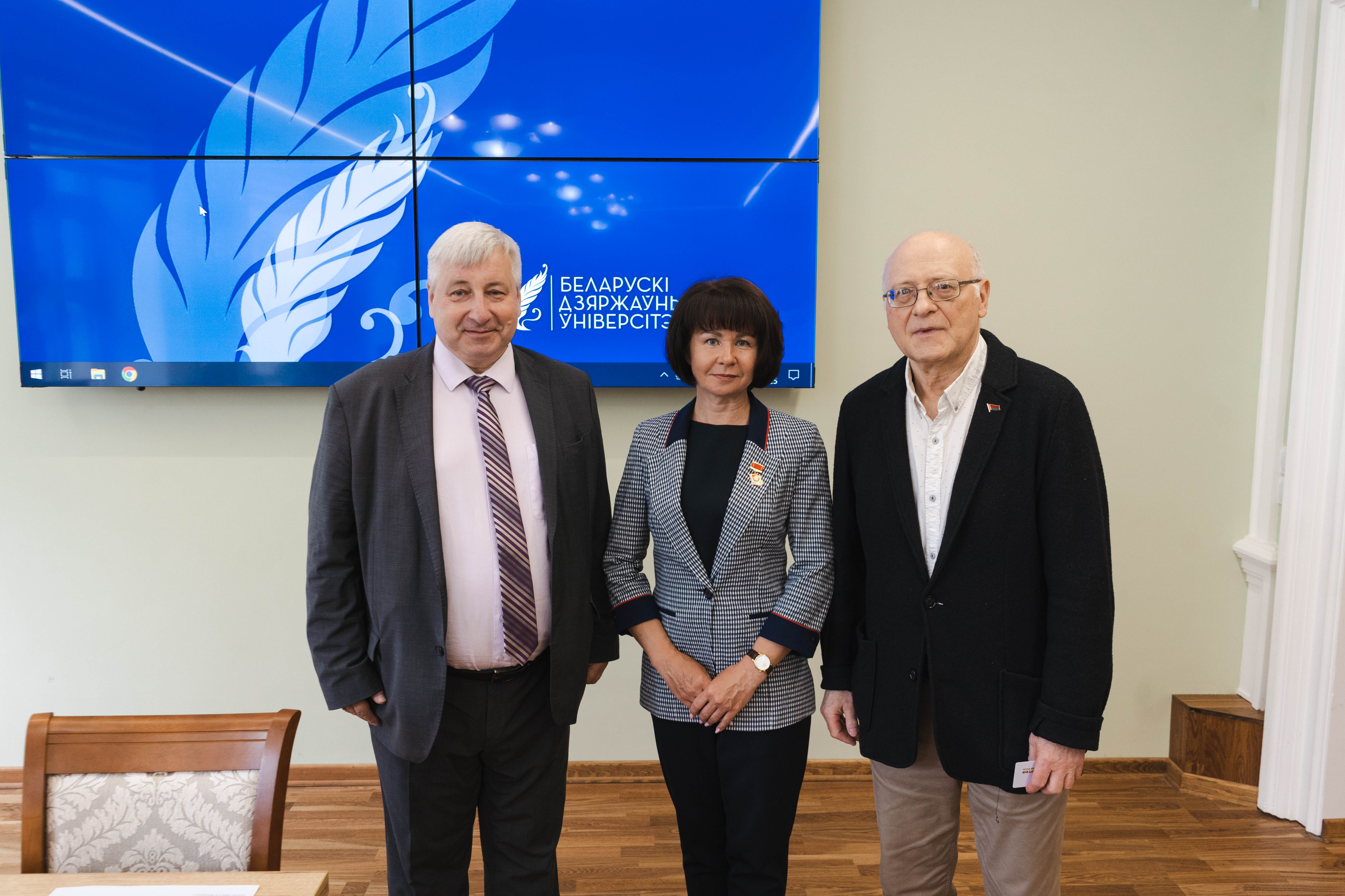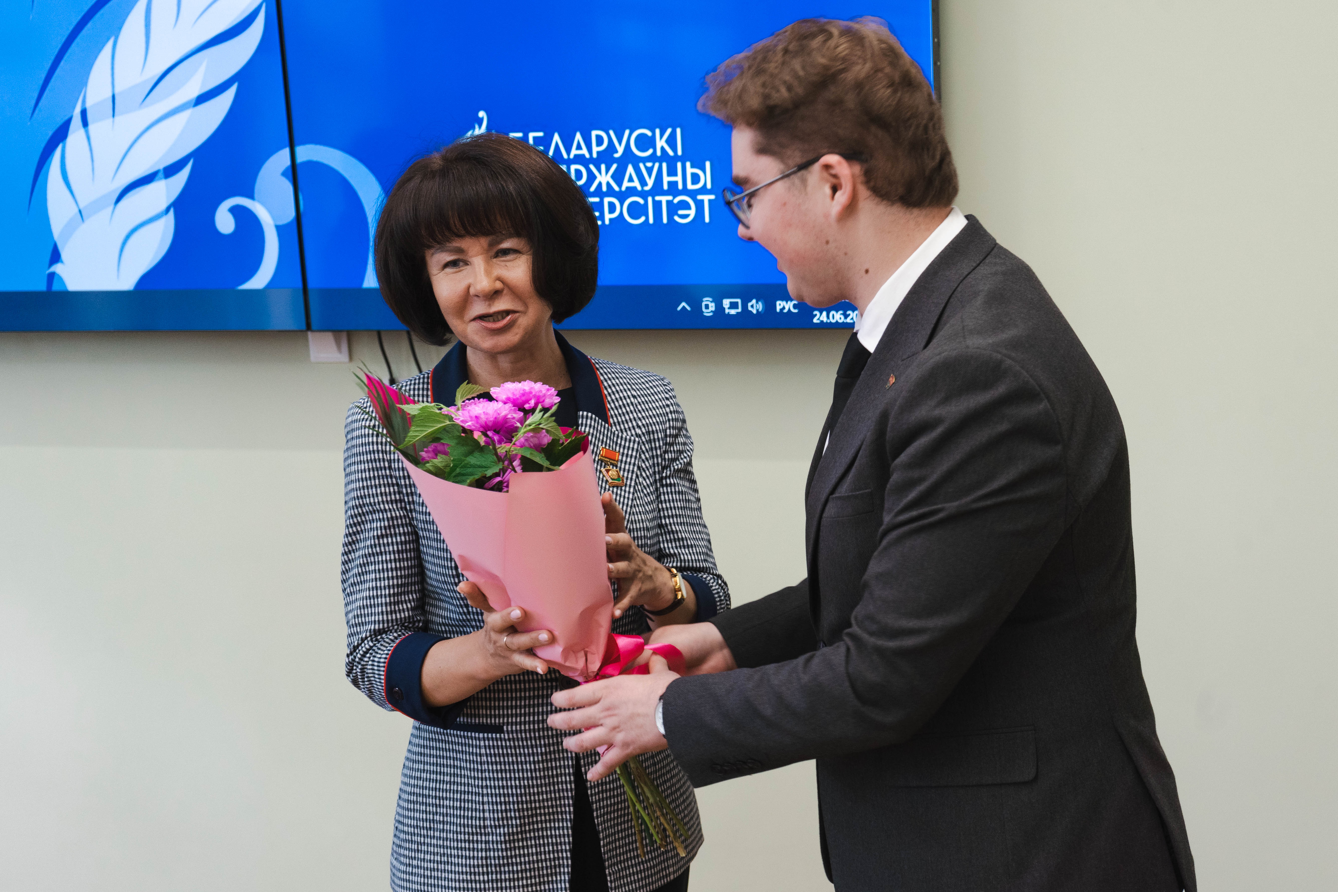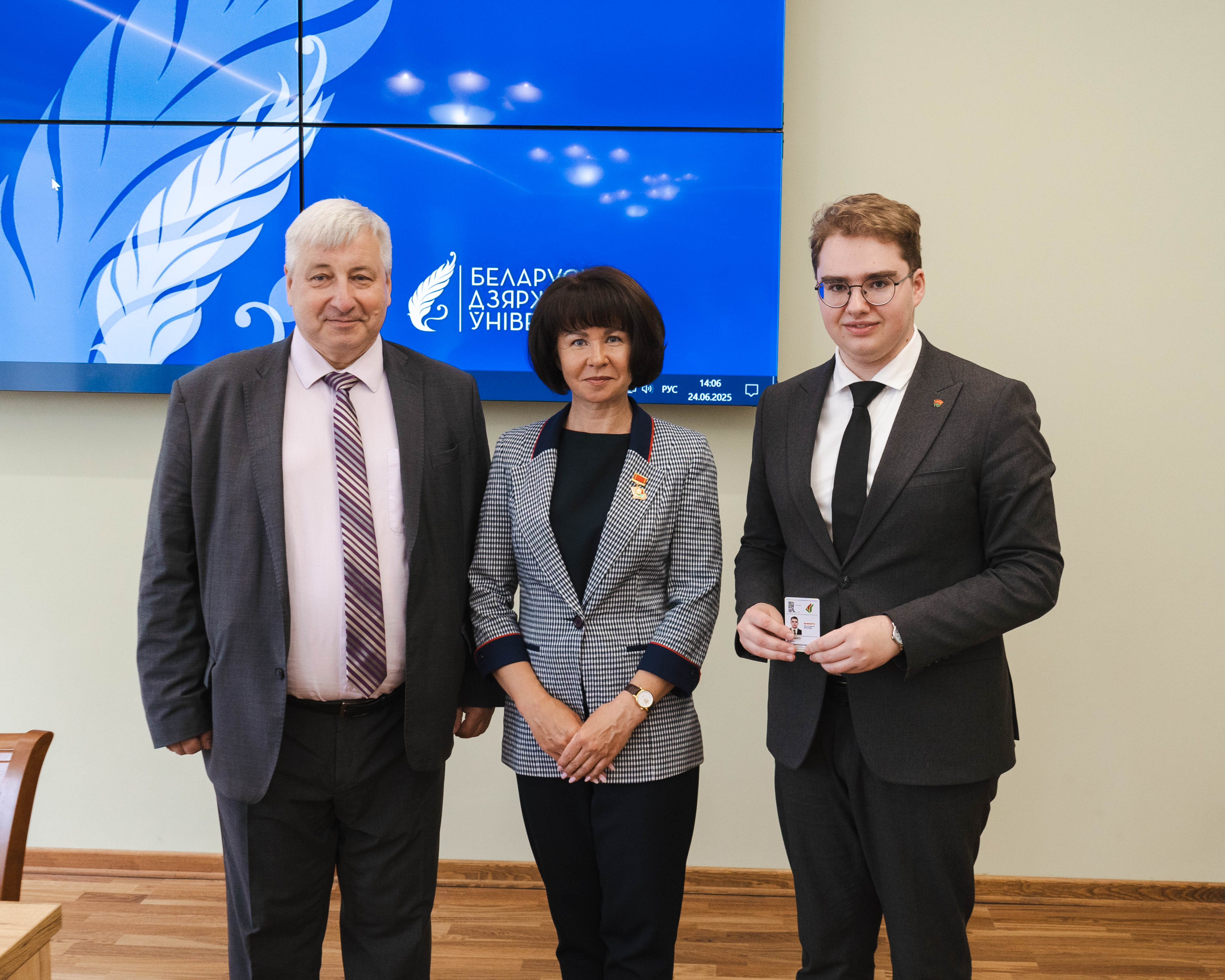 Описание изображения: На историческом факультете БГУ состоялось вручение членских билетов Белорусской партии «Белая Русь». За активную гражданскую позицию и общественную деятельность членский билет получили заведующий кафедрой истории нового и новейшего времени Владимир Кошелев и студент 4 курса Иван Квашко. Билеты вручила председатель Первичной организации БГУ Республиканского общественного объединения «Белая Русь» Марина Гутовская. Напомним, Белорусская партия «Белая Русь» играет важную роль в социально-экономическом развитии и укреплении гражданского общества в Республике Беларусь