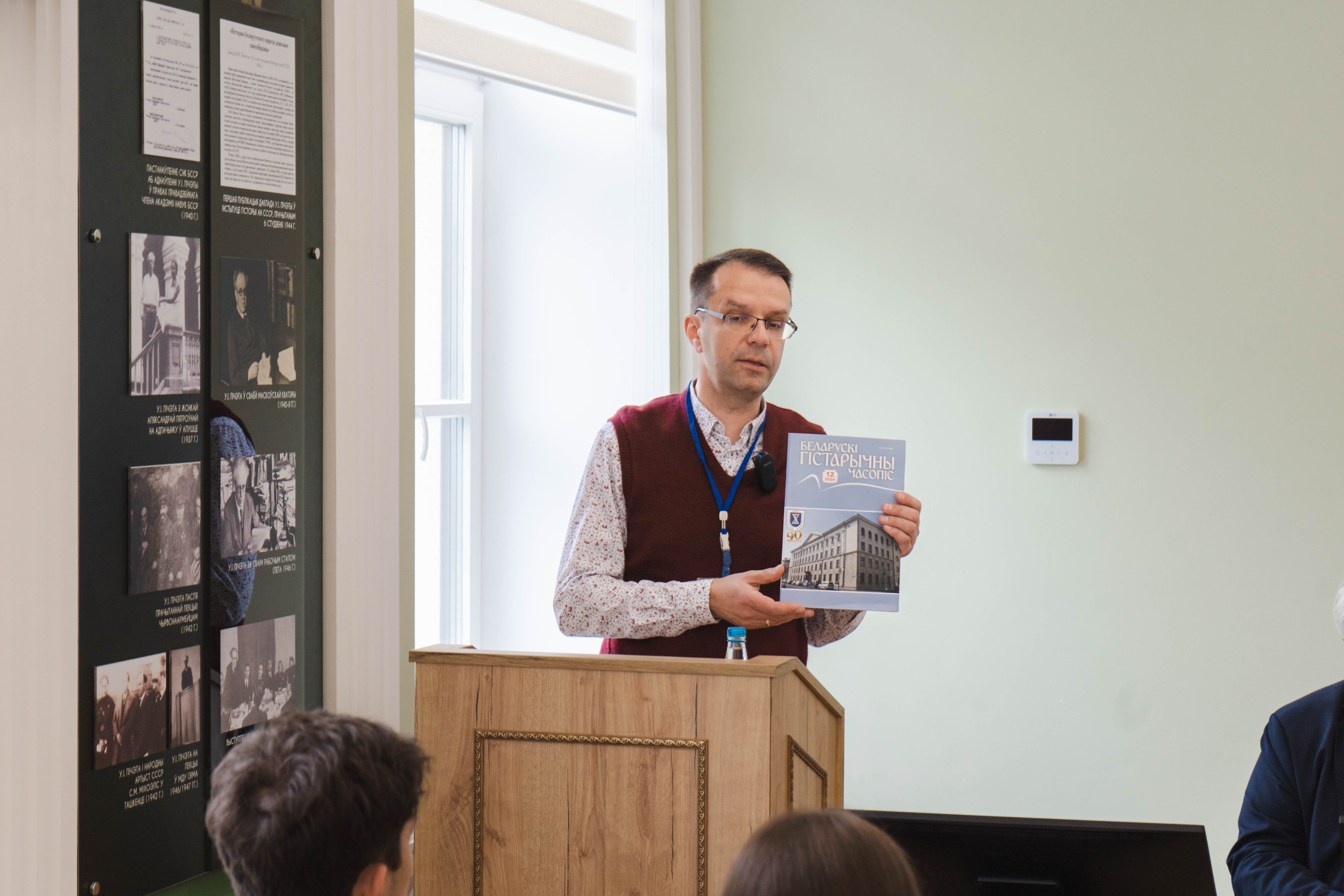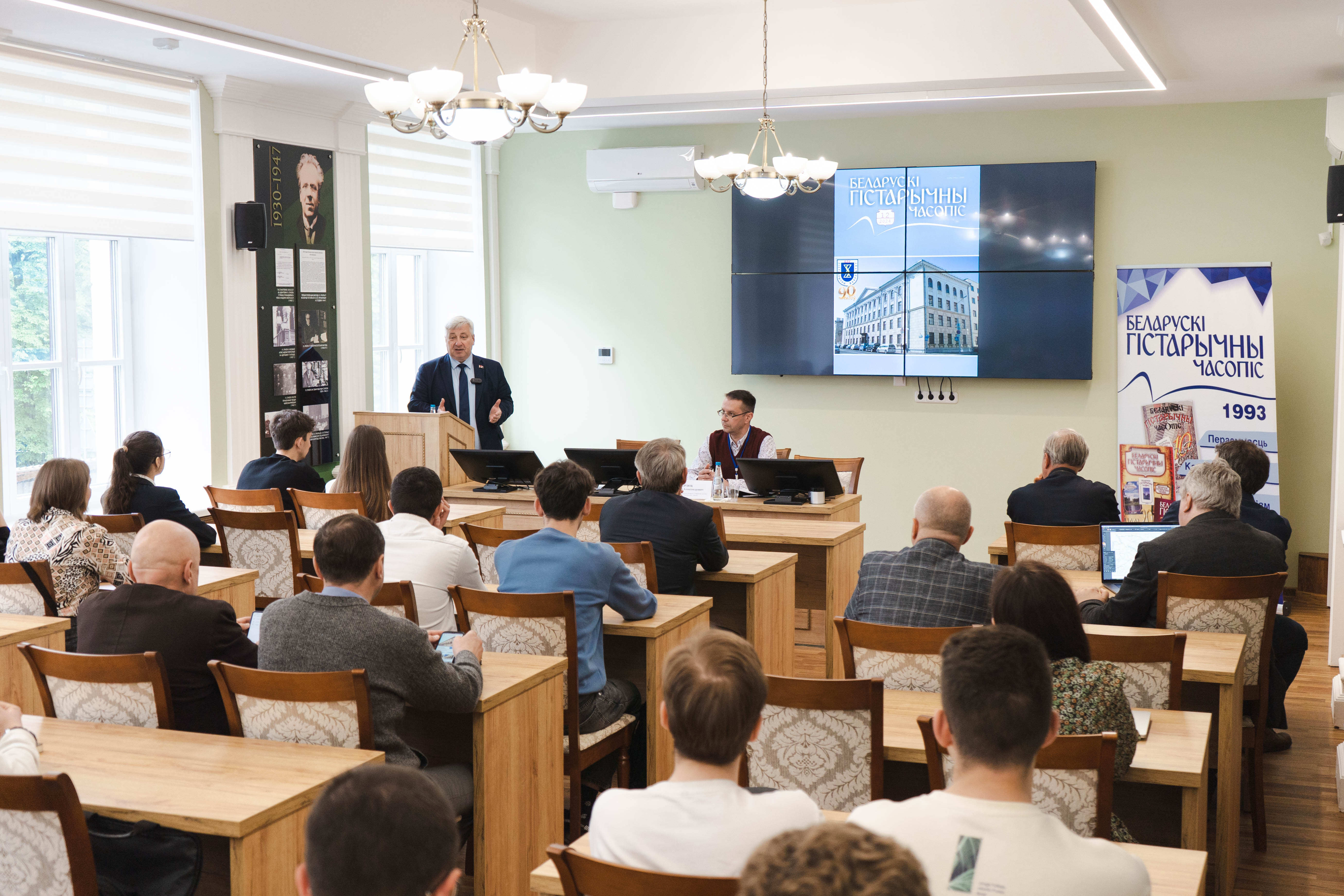 Описание изображения: | Спецыяльны нумар «Беларускага гістарычнага часопіса» прэзентвалі на гістарычным факультэце БДУ 30 мая. Размова ідзе пра тэматычны нумар з серыі «Гісторыя і гісторыкі Беларусі», прымеркаваны да 90-годдзя гістфака БДУ. Сустрэчу адкрыў дэкан гістарычнага факультэта, член рэдкалегіі часопіса, Аляксандр Каханоўскі. Аляксандр Генадзьевіч падкрэсліў, што «БГЧ» сёння з'яўляецца вельмі аўтарытэтным выданнем па гісторыі ў нашай краіне. Ен адзначыў, што прэзентацыя праходзіць ў тым жа будынку, дзе калісьці зарадзіўся «Беларускі гістарычны часопіс». |