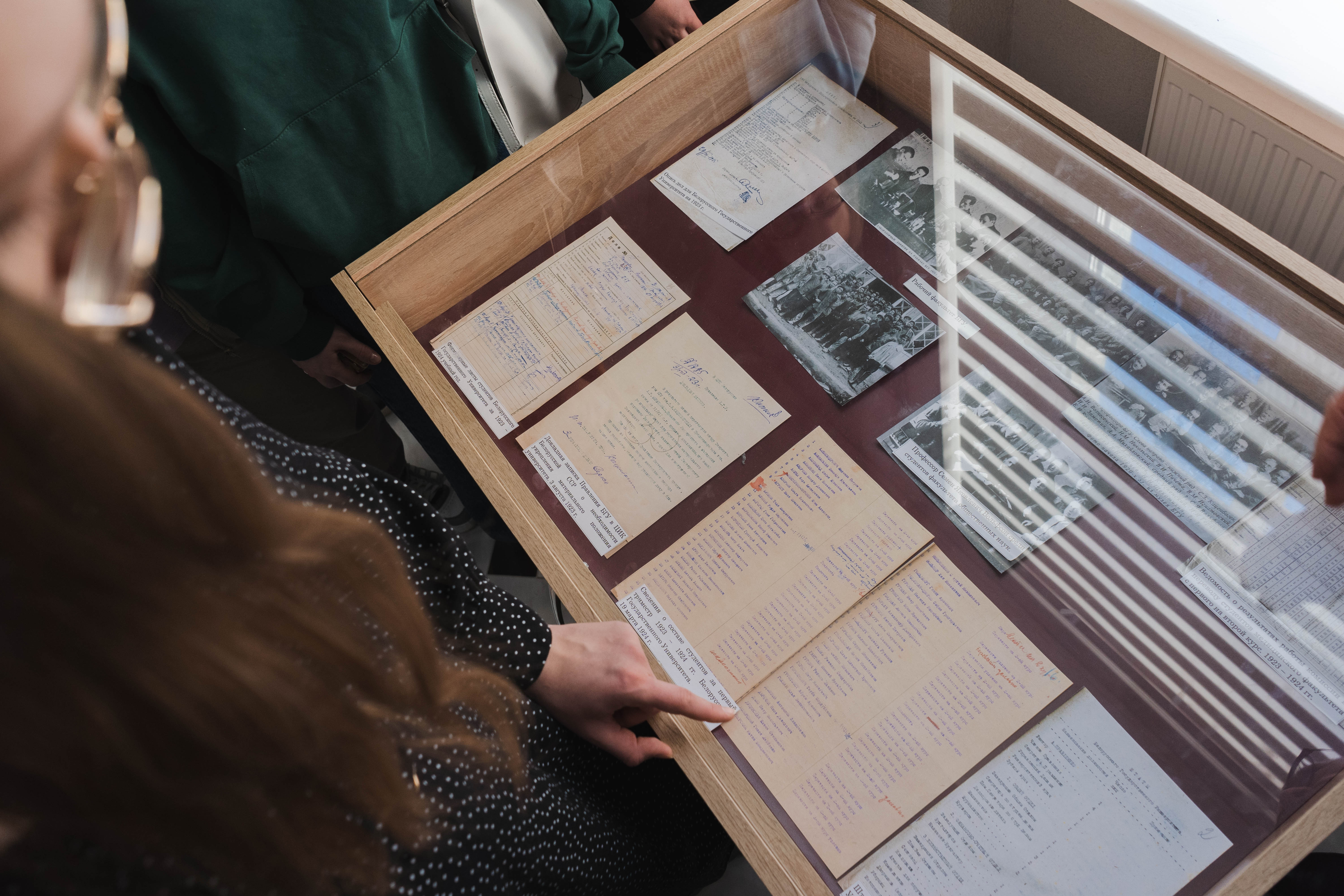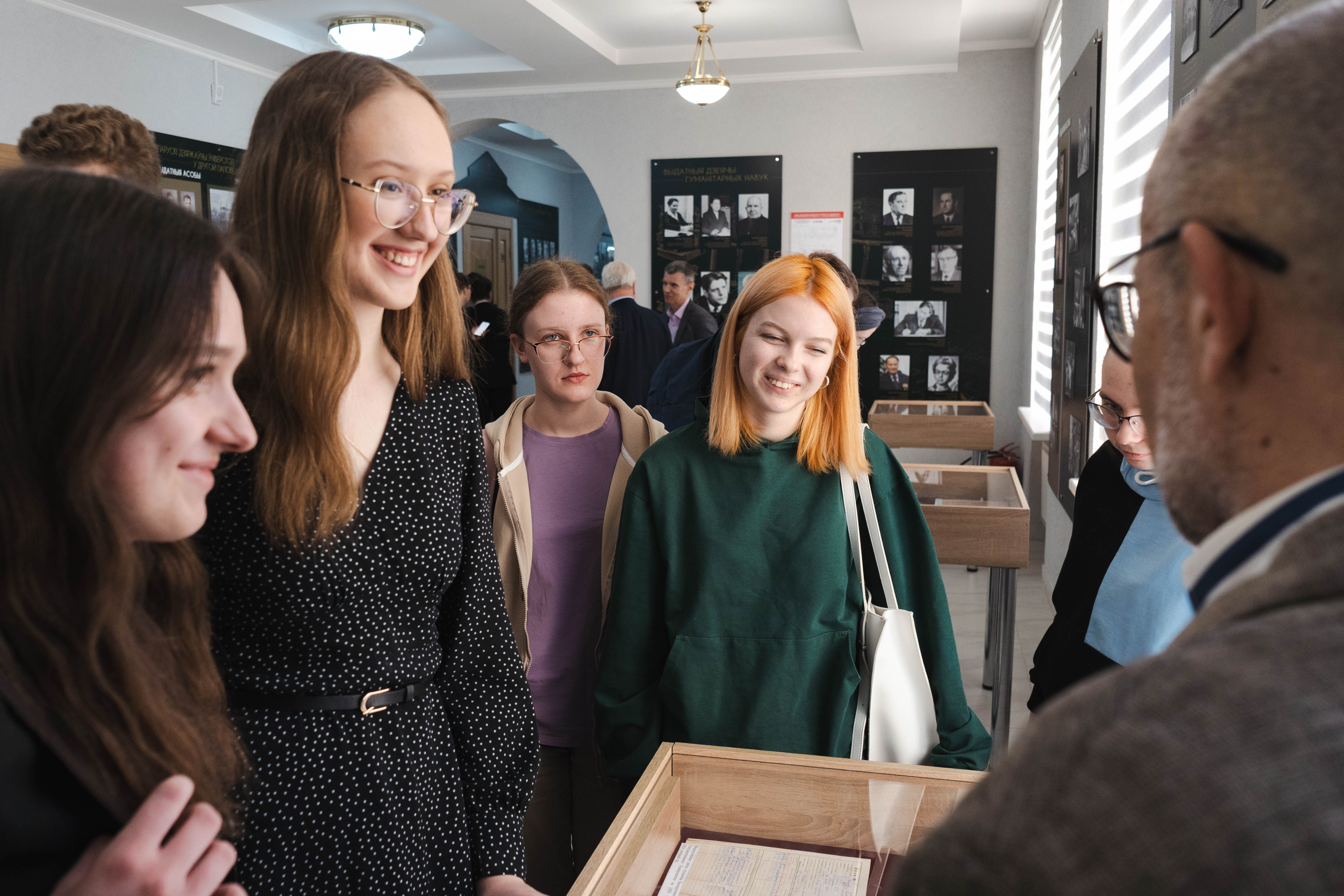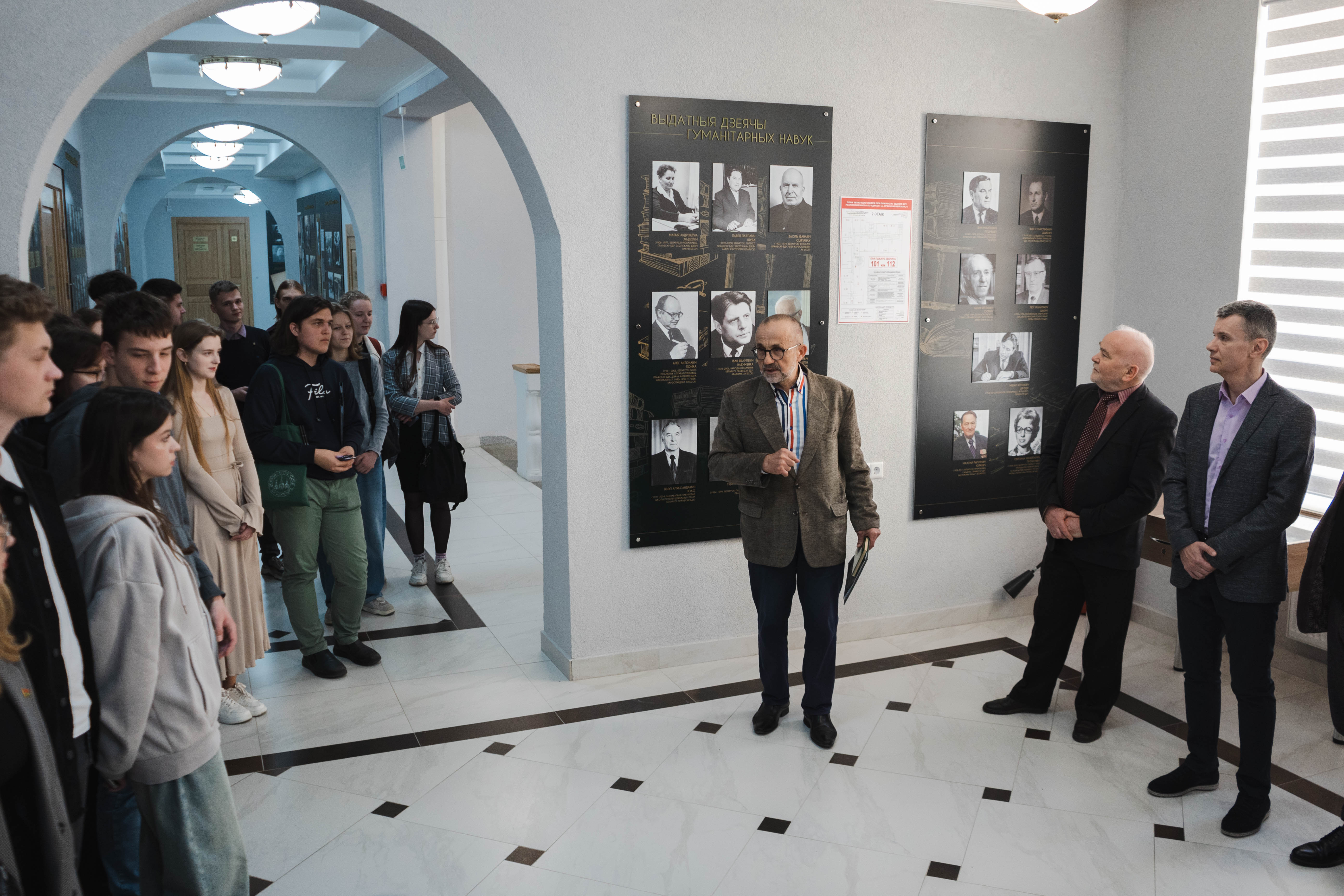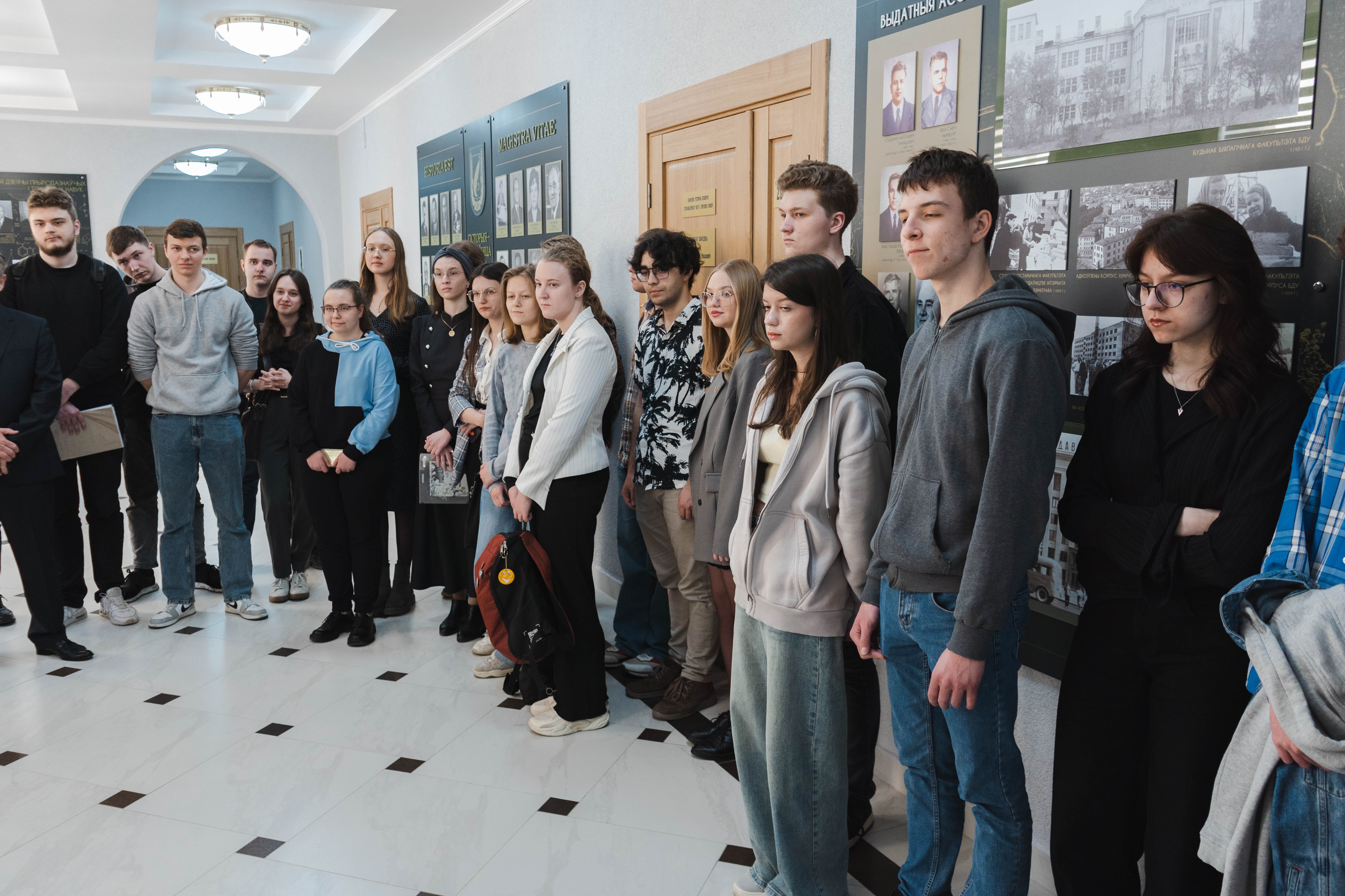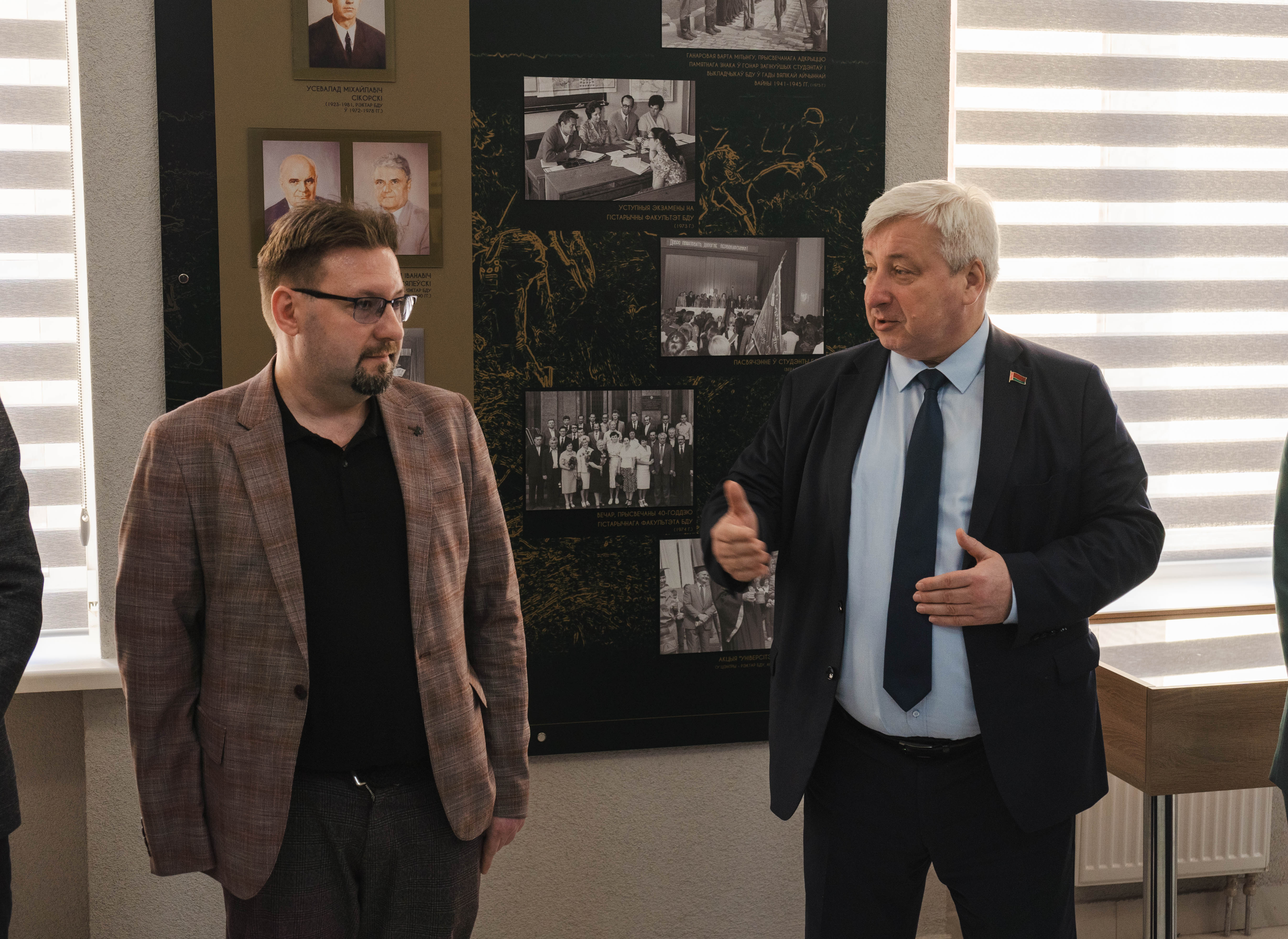 Описание изображения: На историческом факультете состоялось торжественное открытие документальной выставки «Белорусский государственный университет. Начало» (к 100-летию первого выпуска студентов БГУ). Экспозиция подготовлена на основе уникальных документов из фондов Национального архива Республики Беларусь. На открытии присутствовали заместитель директора НАРБ Святослав Кулинок, заведующий музеем истории БГУ Дмитрий Степанов. Как заметил декан факультета, большинство экспонатов выставки касаются студентов БГУ тех лет. Они бережно сохранены уже следующими поколениями студентов - выпускников в том числе и исторического факультета БГУ. Александр Геннадьевич призвал беречь для будущих поколений ценнейшие экспонаты, которыми сегодня гордится исторический факультет. Перед участниками торжественного открытия с докладом о деятельности БГУ с 1921 г. по 1925 г. выступил заведующий кафедрой истории России Олег Яновский. Посетители выставки могли ознакомиться с подлинными приказами, протоколами заседаний, фотографиями БГУ тех лет