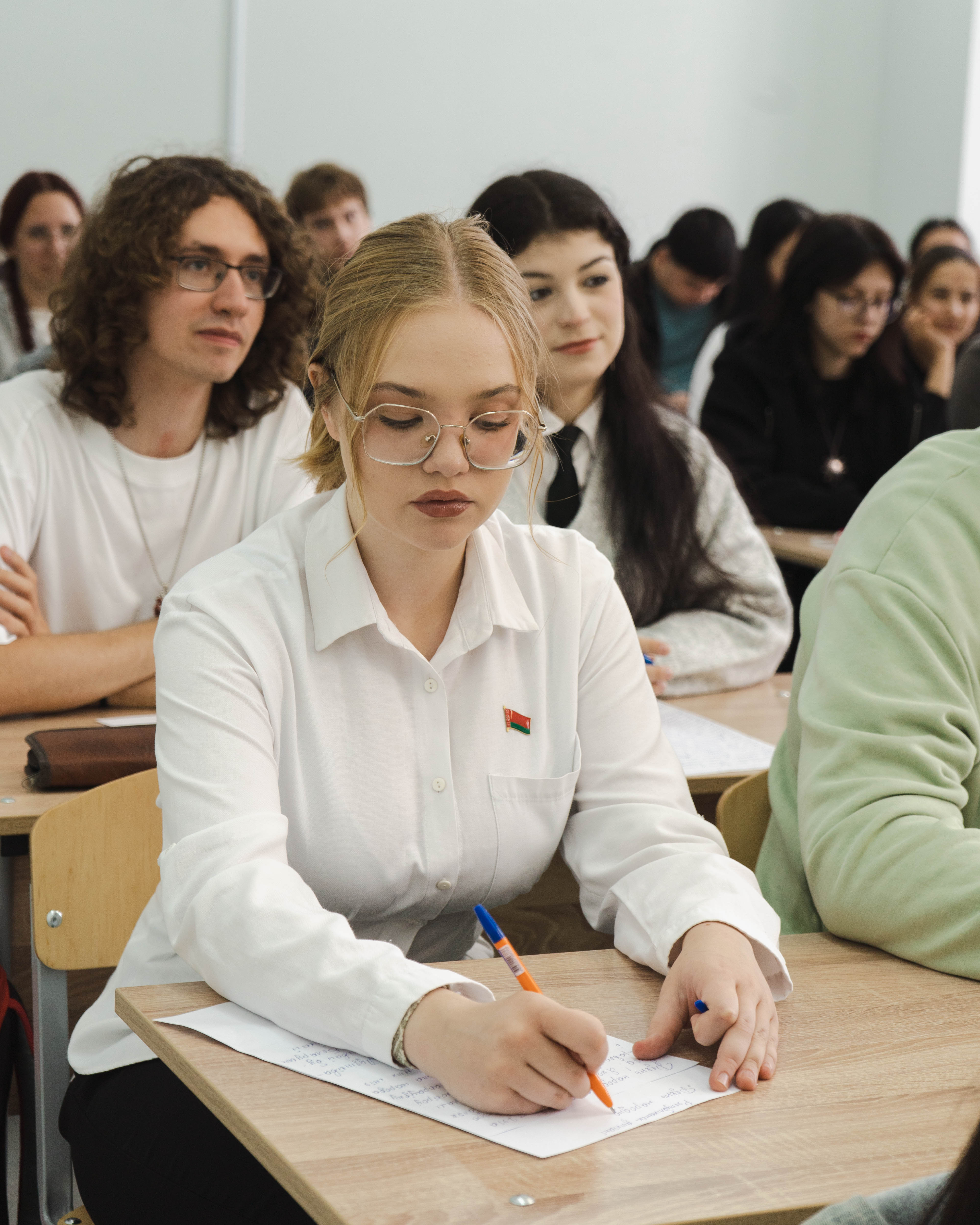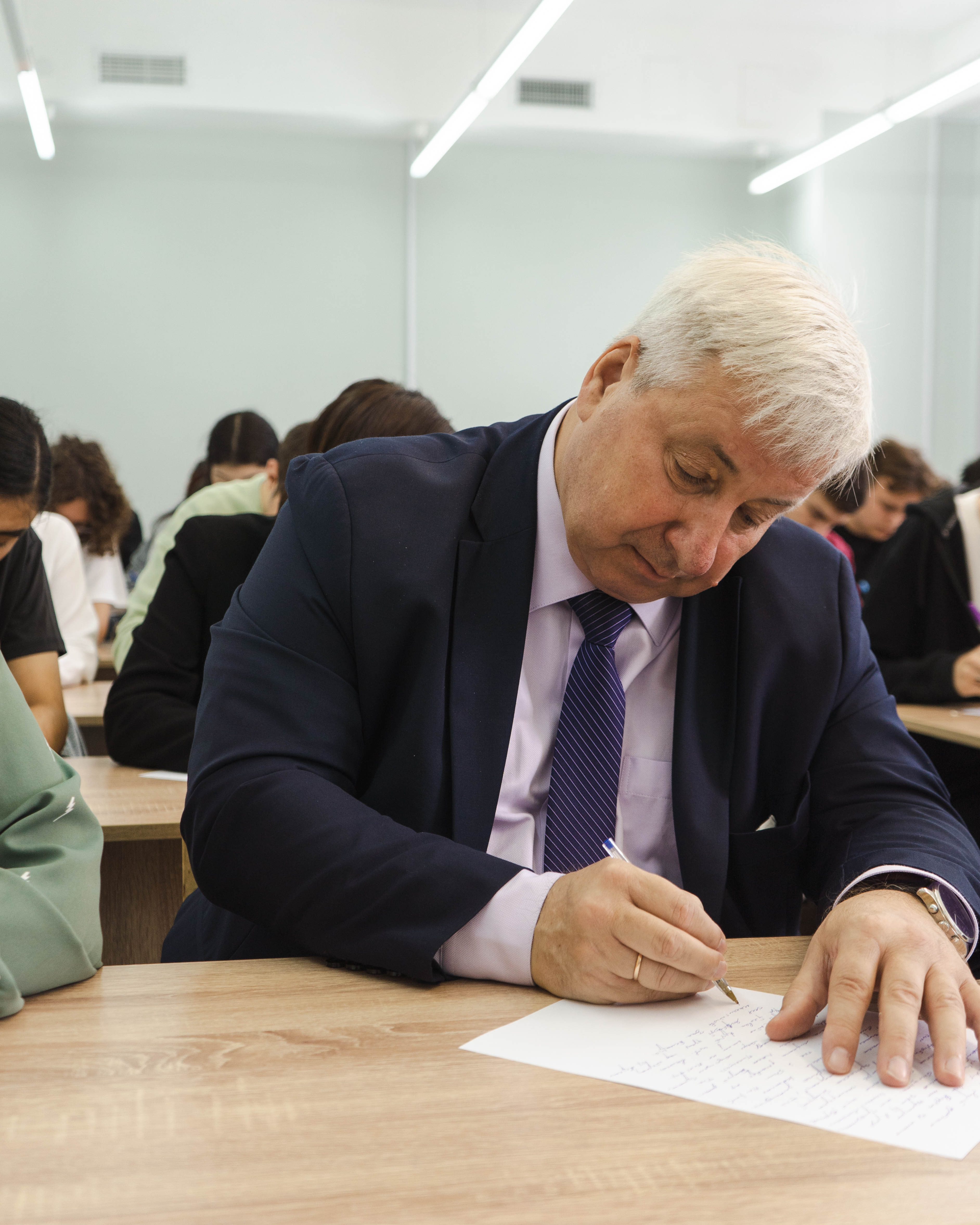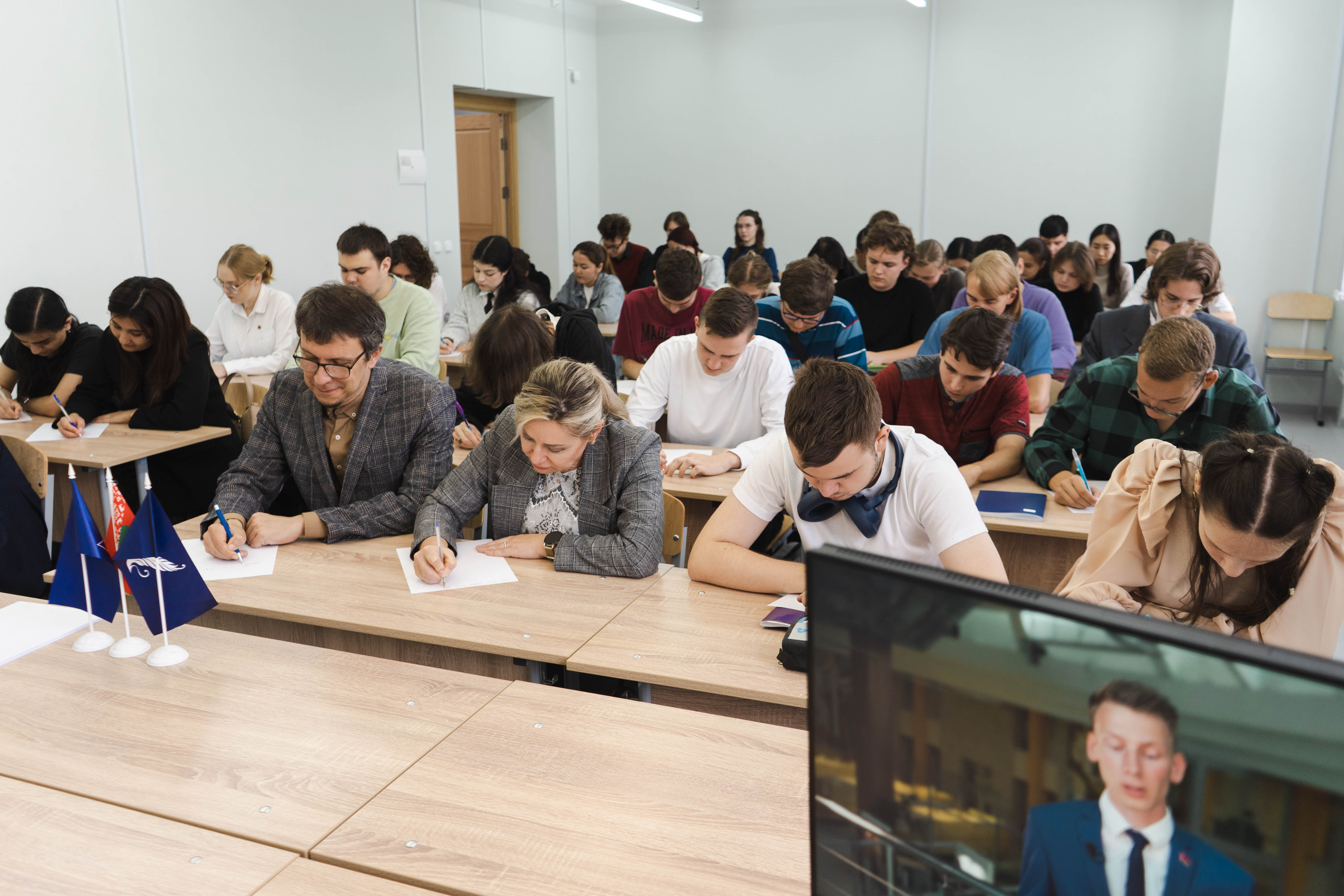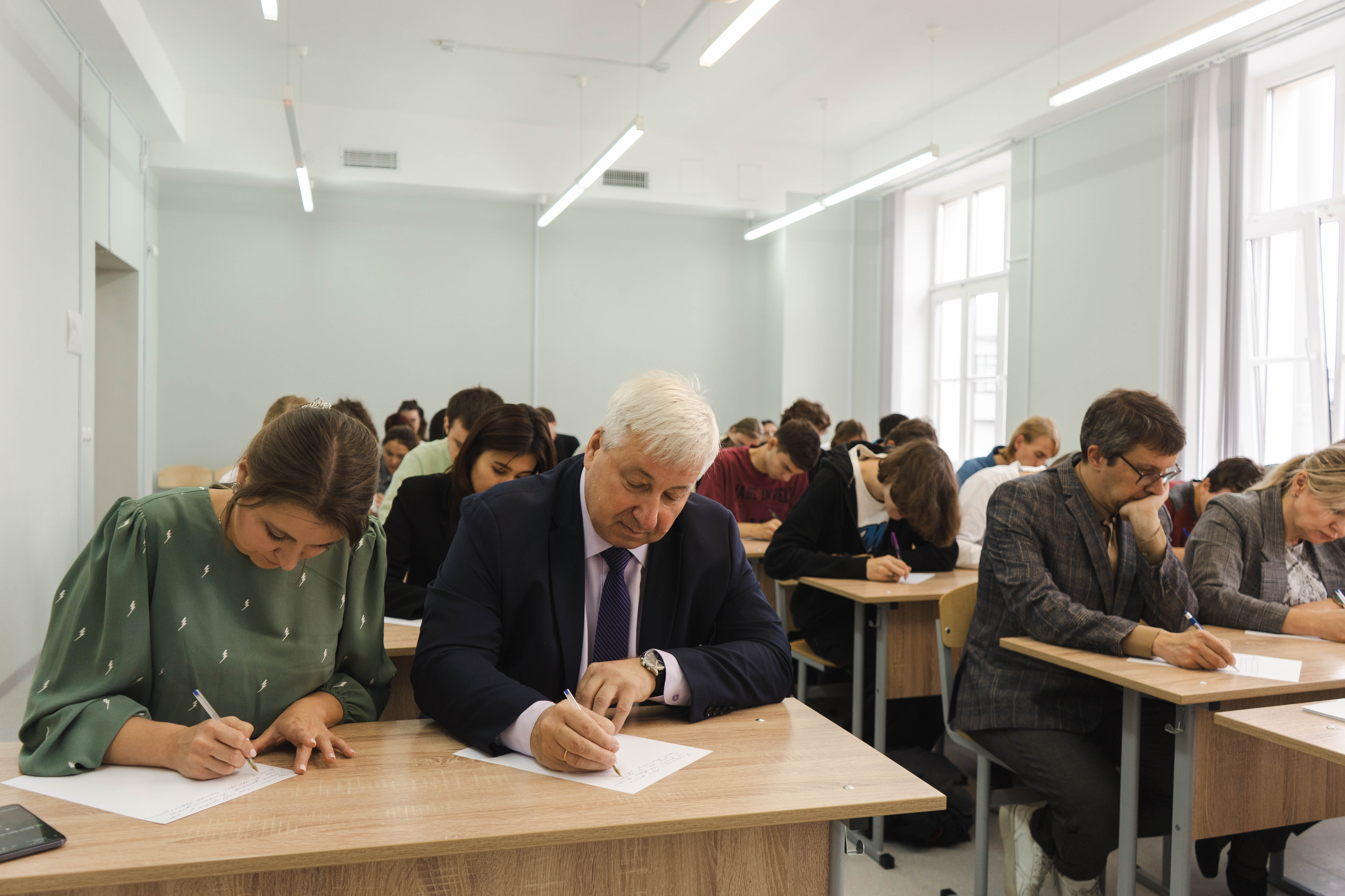 Описание изображения: | Сёння гістарычны факультэт далучыўся да Рэспубліканскай дыктоўкі з нагоды Дня народнага адзінства. За вучнёўскай партай разам з дэканам факультэта прафесарам Аляксандрам Каханоўскім дыктоўку на роднай мове пісалі студэнты першага курса. |