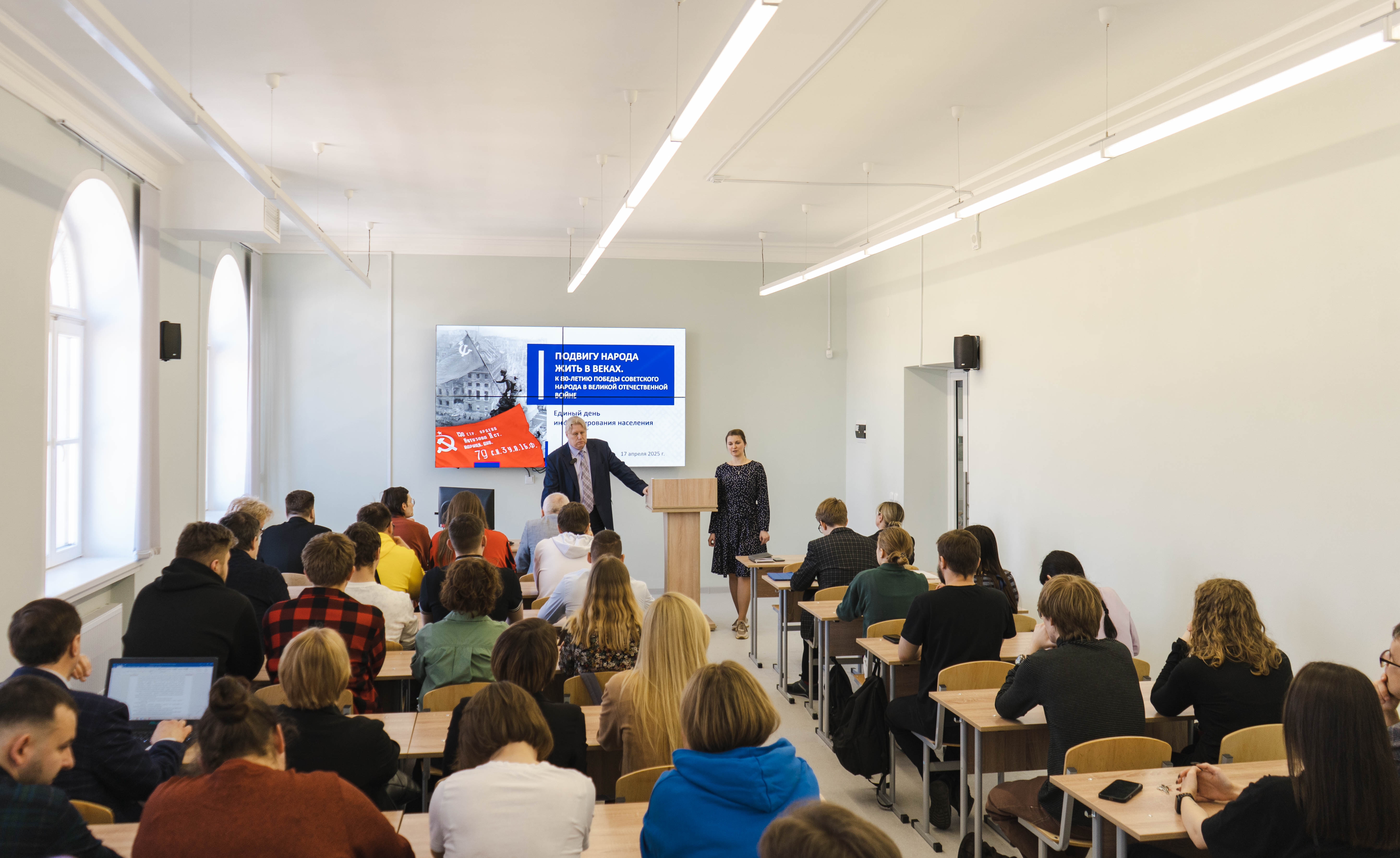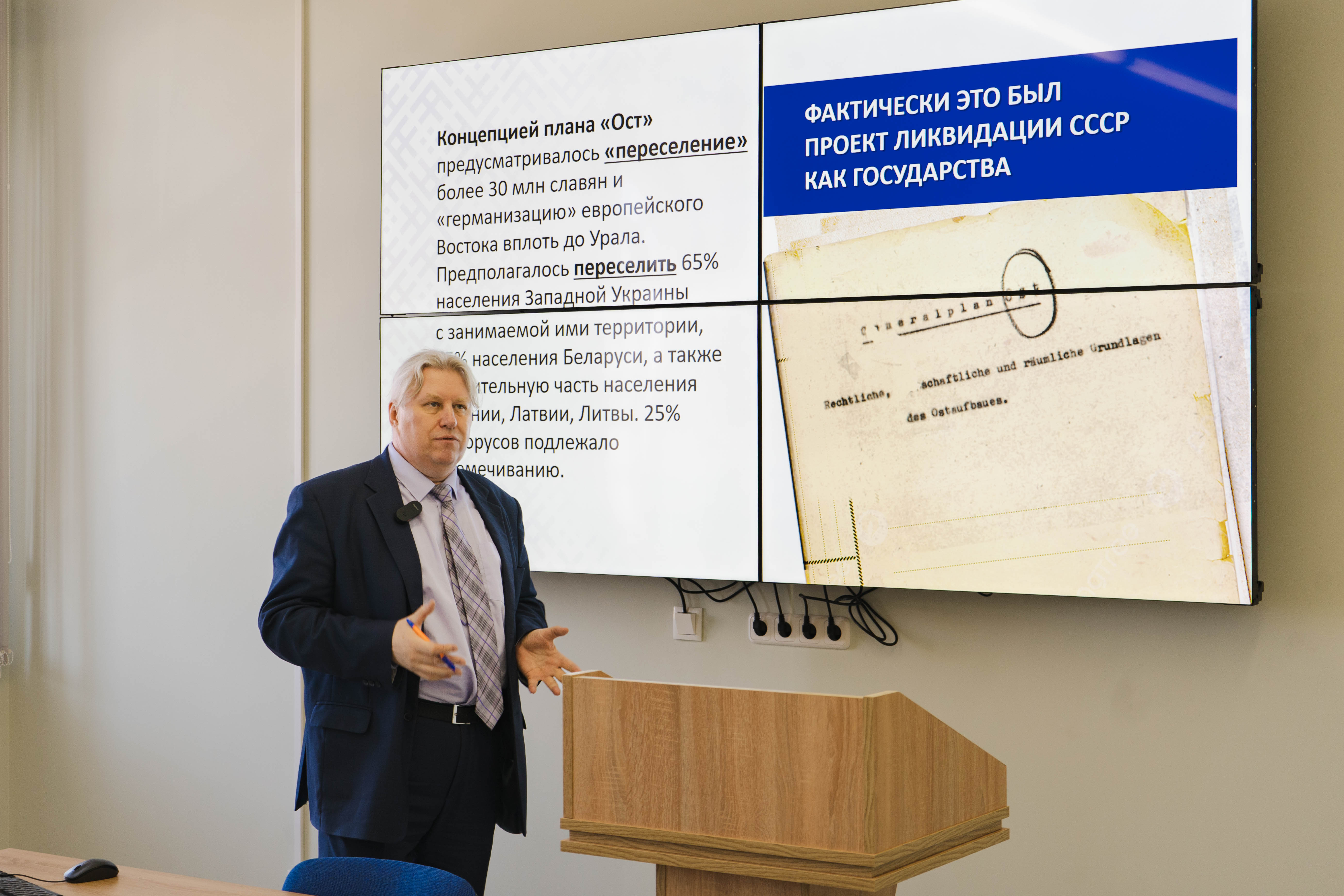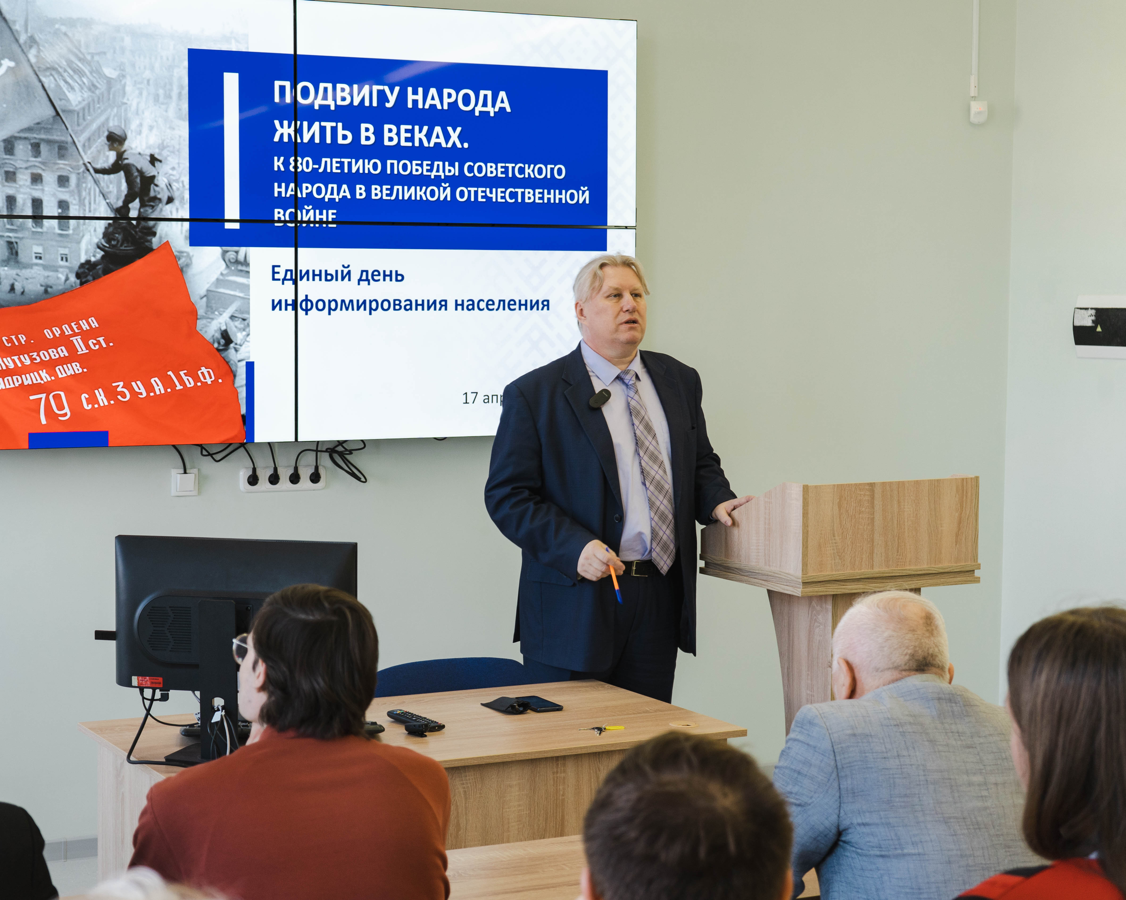 Описание изображения: Единый день информирования на тему «Подвигу народа жить в веках. К 80-летию Победы советского народа в Великой Отечественной войне». Докладчик — опытный спикер, доцент кафедры истории южных и западных славян исторического факультета БГУ Сергей Александрович. Говорили о политике геноцида оккупационных войск на территории Беларуси в период Великой Отечественной войны, вкладе Беларуси в победу над фашизмом, о последних операциях Советской Армии в апреле 1945 г., о партизанском движении в Беларуси, об увековечивании памяти о подвиге предков в наше время. Особо Сергей Сергеевич остановился на жертвах, которые понесла наша страна в военные годы. Докладчик подчеркнул, что сутью нацистской политики на временно оккупированной территории СССР, в том числе в Беларуси, был геноцид и «выжженная земля» – политика массового кровавого террора. В завершение выступления Сергей Сергеевич выразил уверенность, что память о подвиге доблестных победителей и благодарность за завоеванную свободу навсегда сохранятся в наших сердцах