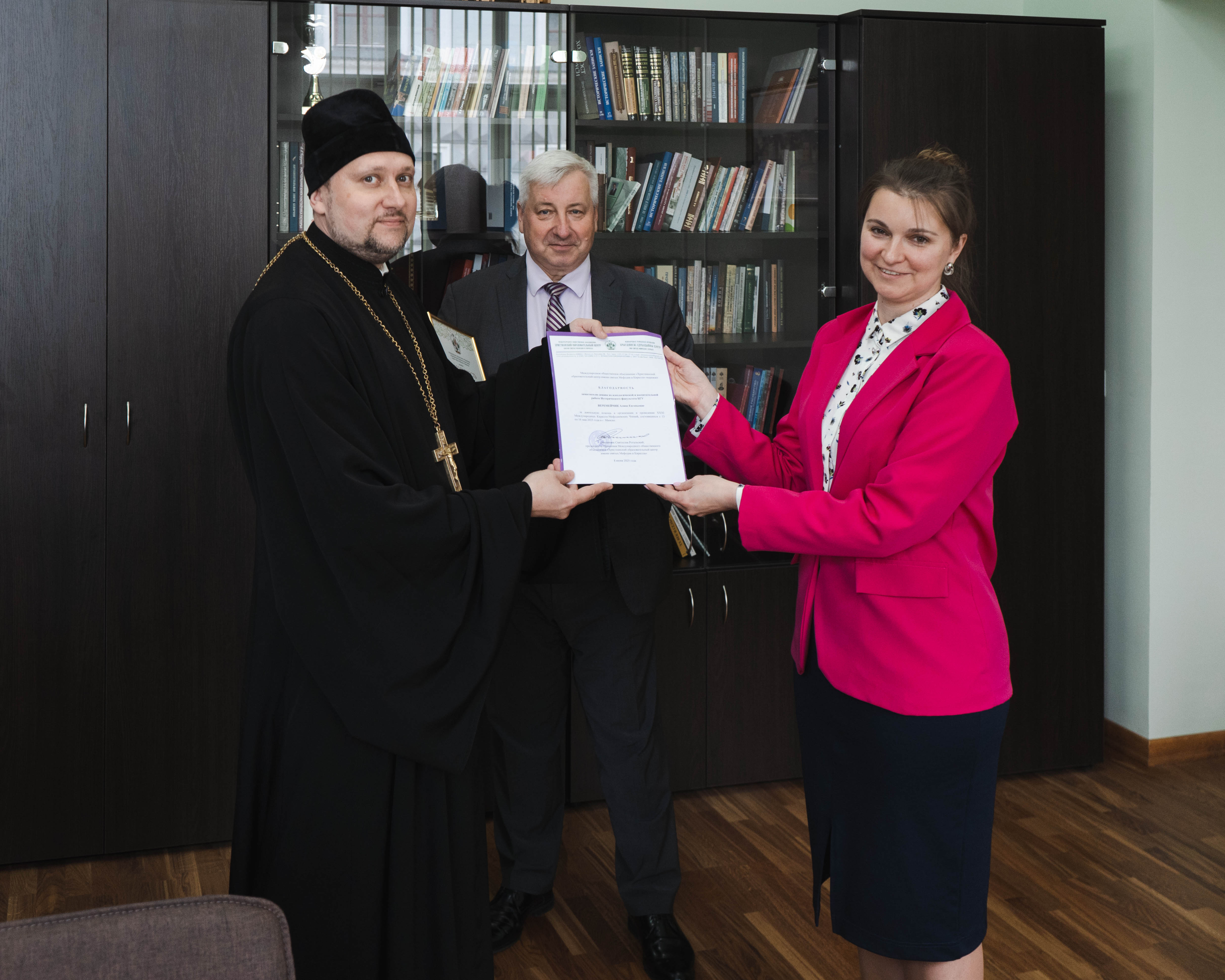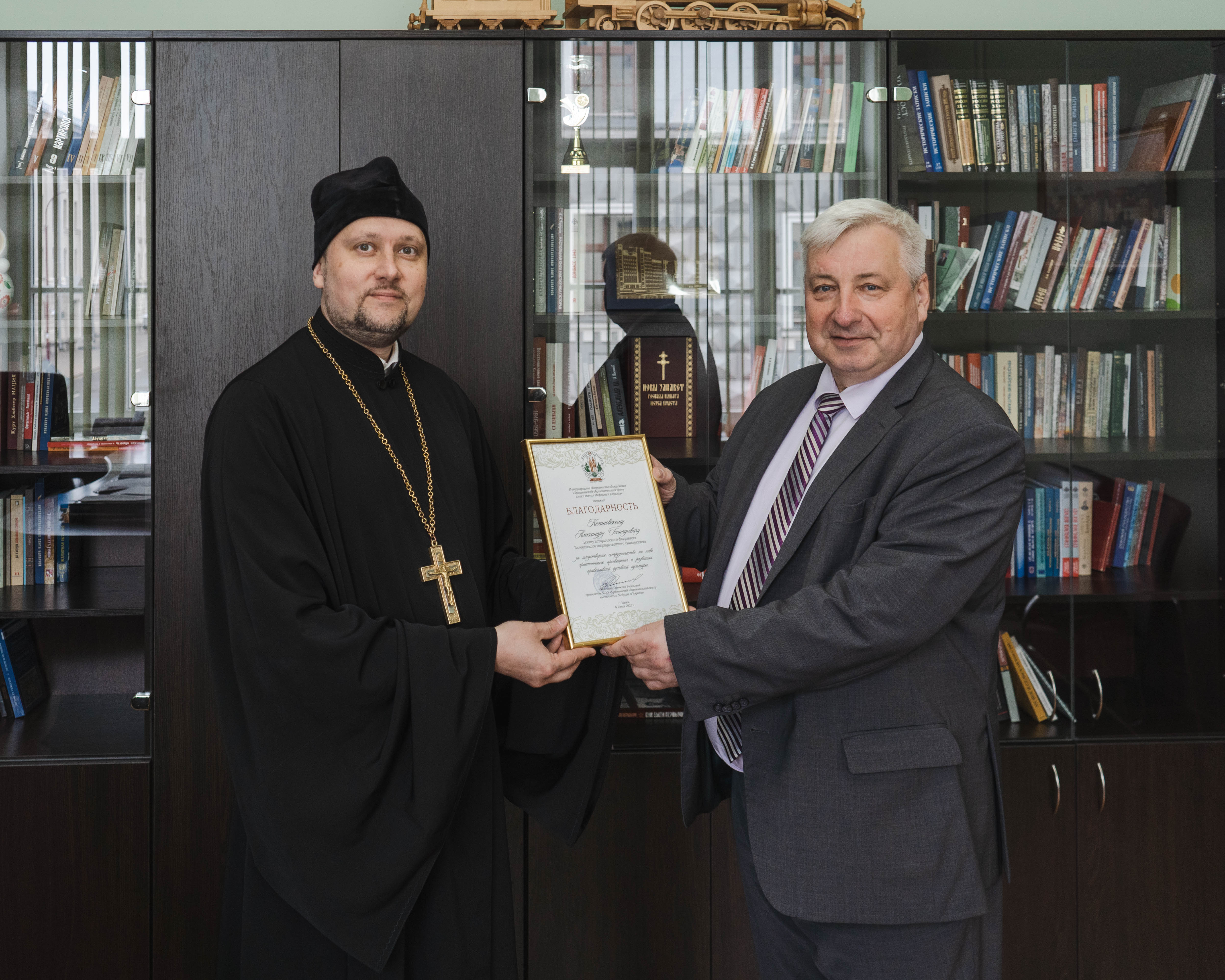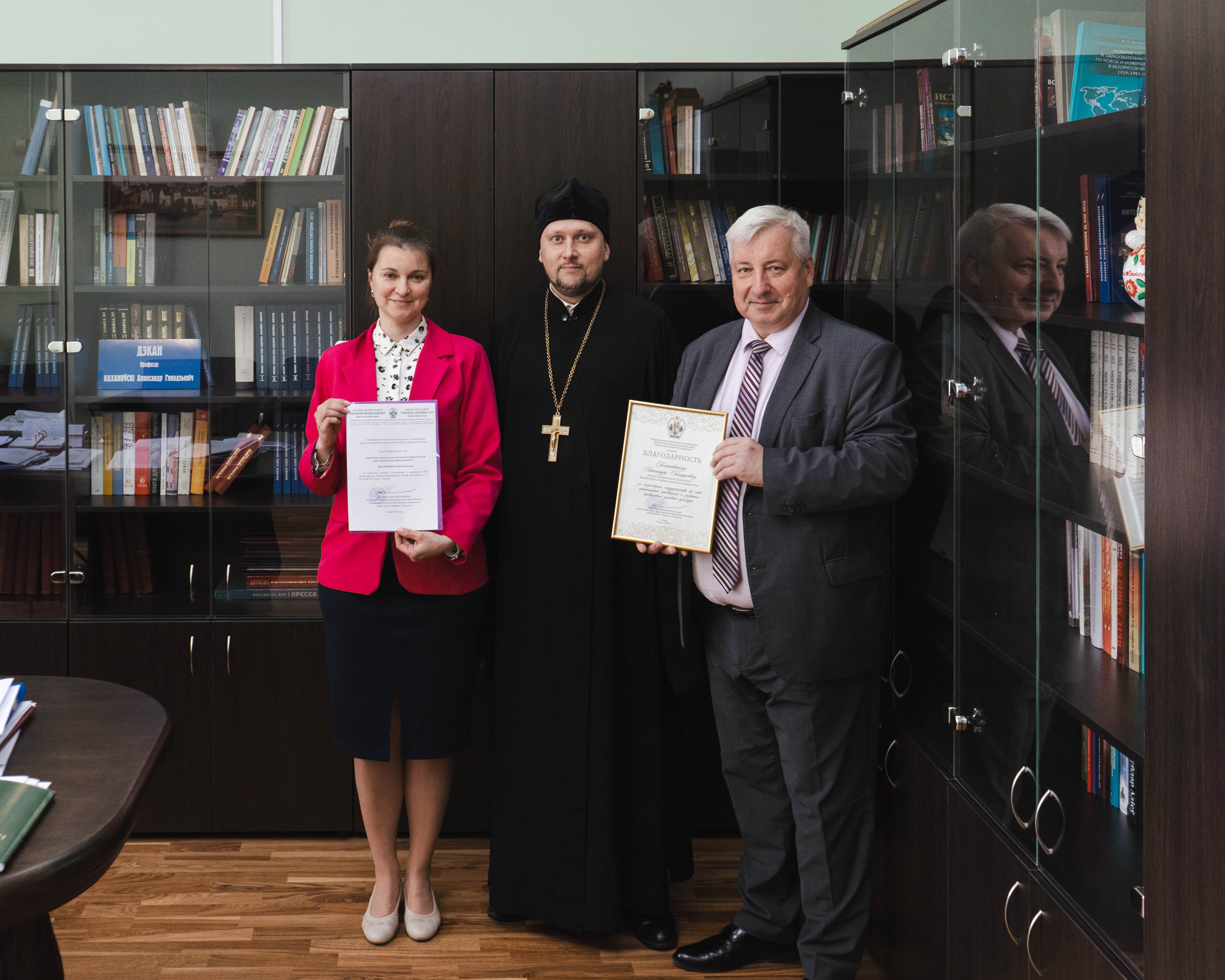 Описание изображения: | Декан исторического факультета БГУ, профессор Александр Кохановский отмечен благодарностью Международного общественного объединения "Христианский образовательный центр имени святых Мефодия и Кирилла". Благодарность декану объявлена за плодотворное сотрудничество в области христианского просвещения и развития православной духовной культуры. Также благодарность Международного общественного объединения "Христианский образовательный центр имени святых Мефодия и Кирилла" объявлена заместителю декана по идеологической и воспитательной работе исторического факультета Алине Веремейчик. Вручил награды иерей Святослав Рогальский. Отметим, что исторический факультет реализует ряд проектов, направленных на развитие и сохранение духовности, культуры, традиций нашей страны. Уже не первый год факультет сотрудничает с Институтом теологии БГУ в рамках разнообразных проектов, в том числе и таких знаковых как Кирилло-Мефодиевские чтения, которые совсем недавно прошли в стенах факультета |
