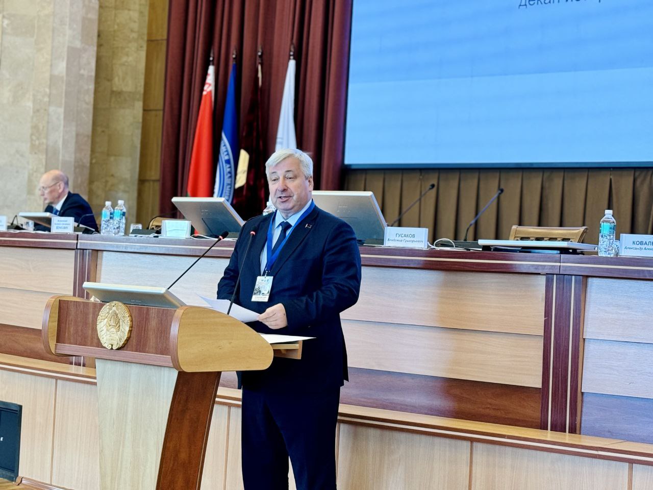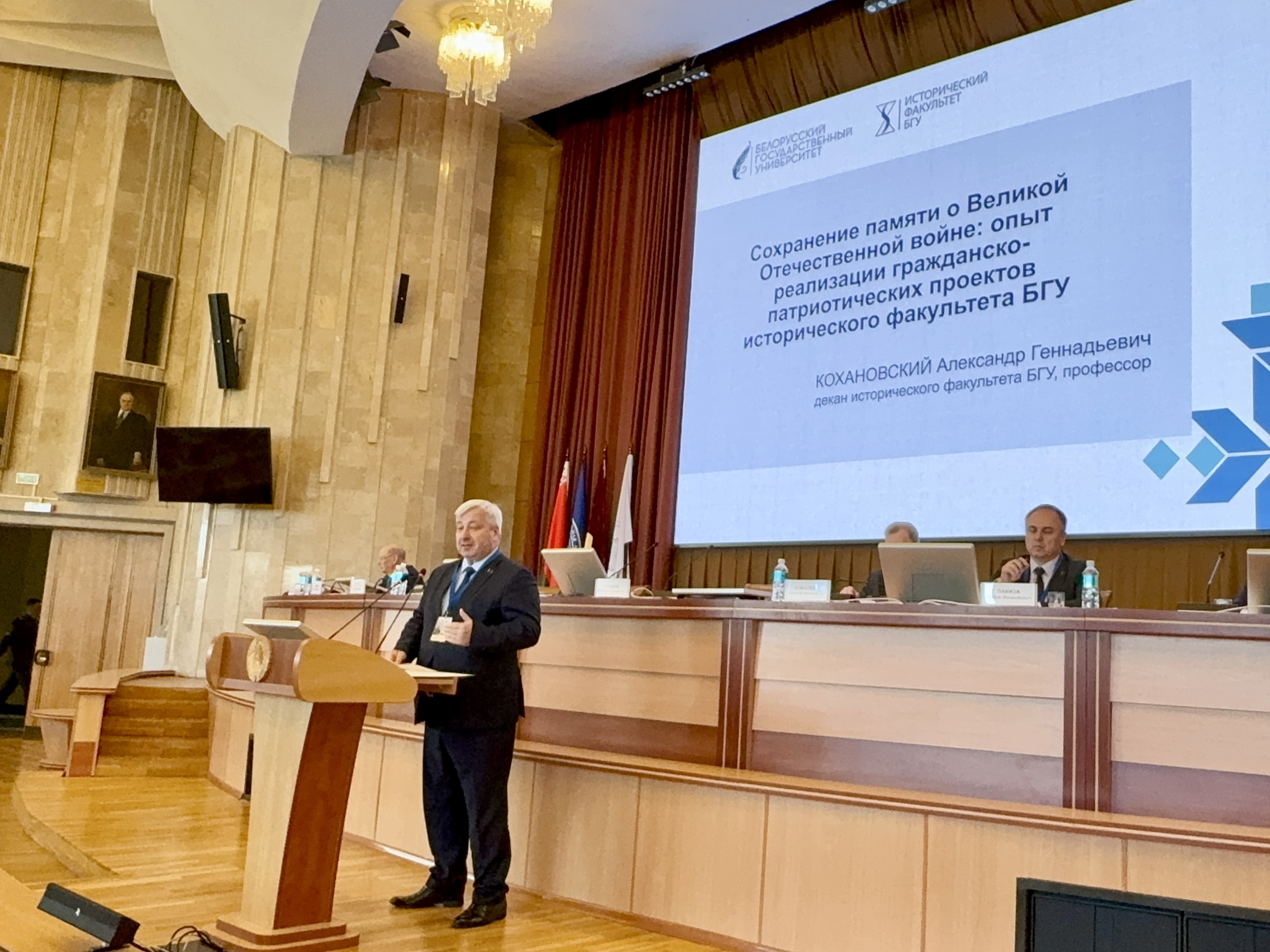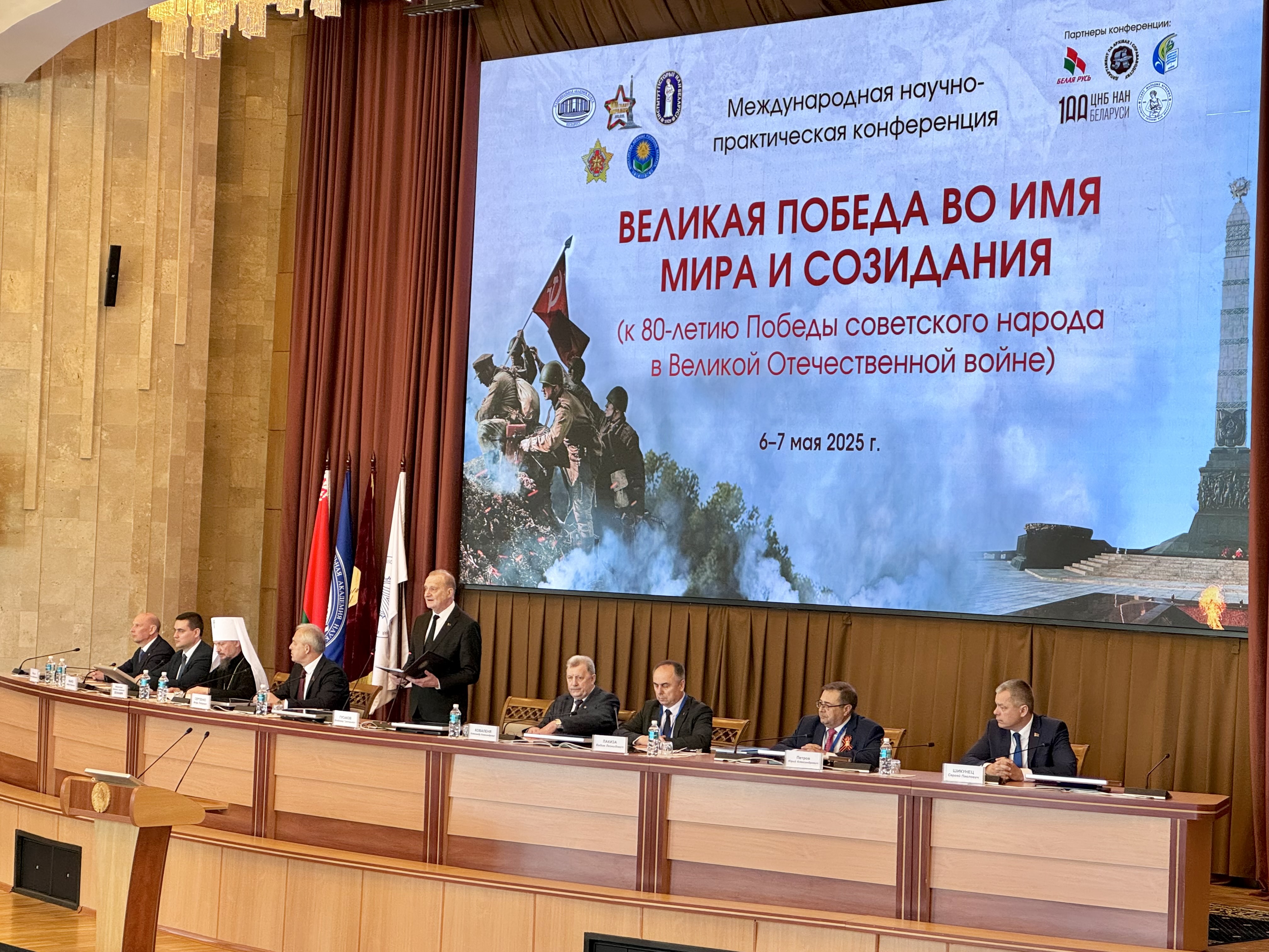 Описание изображения: | Декан исторического факультета БГУ Александр Кохановский выступил с докладом на пленарном заседании Международной научно-практической конференции «Великая Победа во имя мира и созидания (к 80-летию Победы советского народа в Великой Отечественной войне)», состоявшейся на площадке Института истории НАН Беларуси 6 мая 2025 г. Научный форум, организаторами которого выступили НАН Беларуси, Министерство обороны Республики Беларусь и Министерство образования Республики Беларусь, объединил более 200 специалистов по истории Великой Отечественной войны. С приветственными словами к академическому сообществу обратились Председатель Палаты представителей Национального собрания Республики Беларусь Игорь Сергеенко, Председатель Президиума Национальной академии наук Беларуси Владимир Гусаков, министр образования Республики Беларусь Андрей Иванец, министр обороны Республики Беларусь Виктор Хренин, Митрополит Минский и Заславский, Патриарший Экзарх всея Беларуси Вениамин. Выступившие обратили внимание на значимость всестороннего и объективного изучения истории Великой Отечественной войны, недопущения фальсификации ее истории, сохранения памяти о героическом подвиге победителей – задачи, которые стоят перед белорусской исторической наукой. Декан исторического факультета БГУ Александр Кохановский в своем докладе «Сохранение памяти о Великой Отечественной войне: опыт реализации гражданско-патриотических проектов исторического факультета БГУ» обозначил основные результаты научно-образовательной, идеологической и просветительской деятельности историков БГУ, которые вносят существенный вклад в реализацию государственной исторической политики |
