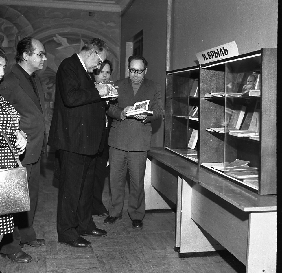 | Описание изображения: | Народный писатель Беларуси Янка Брыль дает автограф заведующему отдела обслуживания учебной литературой Рукшину Александру Мейеровичу. |