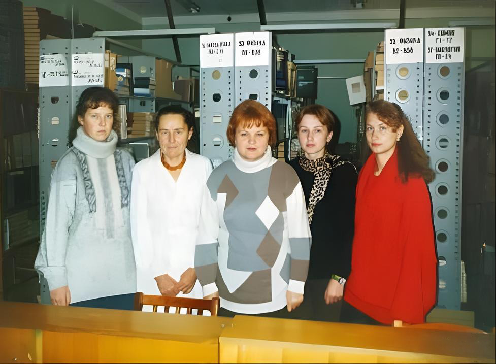 | Описание изображения: | На фотографии коллектив отдела в 1996 году слева направо: Бурыкина С.В, Владысик З.И., Дубина Л.А., Щекина И.Н., Шамак Т.Ю. |