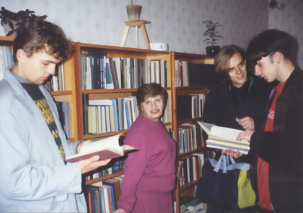 | Описание изображения: | 90-е годы. В 1991 году библиотека получила разрешение на продажу невостребованной и выведенной из основного фонда литературы . На фото заведующий отделом Дубок (Качан) Лариса Владимировна демонстрирует студентам и работникам БГУ выставку-продажу невостребованной литературы. |
