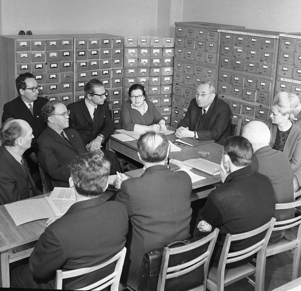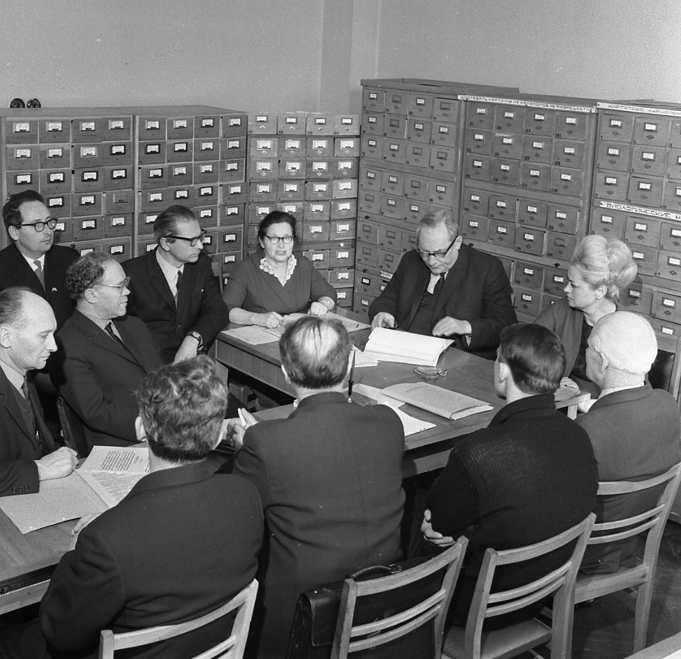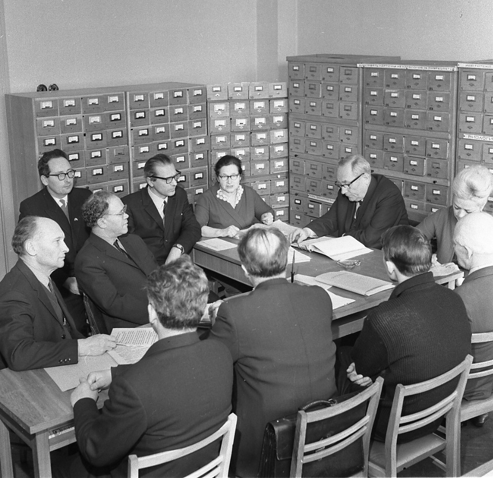 | Описание изображения: | 9 марта 1969 года в Фундаментальной библиотеке состоялось заседание Ученого совета БГУ. На совете присутствовали заведующий отделом обслуживания Рукшин Александр Мейерович и директор библиотеки Любина Розалия Герасимовна |