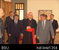 Описание изображения: 19 июня государственный секретарь папы римского Бенедикта XVI кардинал Тарчизио Бертоне посетил Белорусский государственный университет. Высокого гостя встречал ректор учебного заведения Василий Стражев.Кардинал Т.Бертоне выступил перед преподавателями и студентами с лекцией на тему: "Вера и разум: Как говорить о Боге современному человеку". Государственный секретарь папы римского находился в Беларуси с официальным визитом, который продлился по 22 июня. Он встретился митрополитом Минским и Слуцким Филаретом, патриаршим экзархом всея Беларуси, с министром иностранных дел Сергеем Мартыновым и уполномоченным по делам религий и национальностей Леонидом Гуляко, посетил центр "Каритас" под Минском, где проживают дети с онкологическими заболеваниями. В программе визита было возложение венков к монументу на площади Победы в Минске, посещение Пинска (Брестская область) и Гродно, встреча с членами Конференции католических епископов Беларуси, участие в богослужениях, ряд других мероприятий.