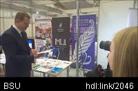 Название документа: XX Международная выставка «СМI ў Беларусі». Телеведущий Олег Лепешенков у стенда БГУ (1 фото)