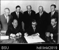 Описание изображения: | Подписание договора о дружбе и сотрудничестве на 1972-1973 уч. г. между Белорусским государственным университетом и Софийским университетом им. К. Охридского состоялось в декабре 1971 г. |
