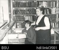 | Описание изображения: | Сотрудники отдела обслуживания учебной литературой Н.Ф.Бахарь и Л.Л.Ковальчук обсуждают вопрос правильной расстановки алфавитного каталога. |