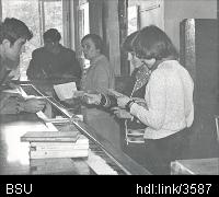 | Описание изображения: | Старший библиотекарь Зайцева Л.И. и библиотекарь Сергеева Н.М. обслуживают читателей. |
