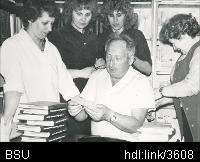 | Описание изображения: | Заведующий отделом Рукшин А.М., главный библиотекарь Ковальчук Л.А., старшие библиотекари Лобанова М.А и Остринская В.В, библиотекарь Борисова Г.Н. готовят литературу к групповому обслуживанию читателей. |