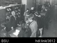 Описание изображения: Заведующий отделом Рукшин А.М., библиотекарь 1-ой категории Малашкевич В.Н. и библиотекарь 2-ой категории Волохович Н.В. обслуживают читателей.