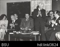 | Описание изображения: | Читательская конференция по творчеству советского писателя, академика АН БССР, участника ВОВ И.Е.Науменко проведена на географическом факультете. Принимали участие ветеран ВОВ, профессор географического факультета Н.Т.Романовский, герой Советского Союза полковник П.Г.Колесников и др. |
