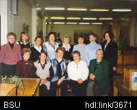 Описание изображения: В 1999 году в состав отдела входили : абонемент учебной литературы, студенческий читальный зал литературы по социальным и гуманитарным наукам, студенческий читальный зал по естественным наукам, 2 читальных зала географического факультета, читальный зал факультета журналистики, читальный зал факультета доуниверситетского образования. На фото сидят слева направо: Ушакова Л.Н., Ковальчук Л.А., Поплевко В.Н., Телеш В.Н., Шилович А.Н. Стоят слева направо: Цупикова Л.П., Дубовец О.А., Дайнеко В.Ф., Запольская С.С., Мицкевич Л.П., Николаева Е.Г., Якимович Н.