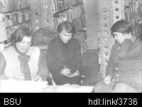 | Описание изображения: | Идет производственное совещание. На фото: заведующий отделом Морозова А.Т., старший библиотекарь Мещерякова Н.Н, старший библиотекарь Гумбар Л.П,, библиотекарьСай И.Н. и др. |