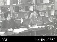 | Описание изображения: | Главный библиотекарь Ляхович Р.И. принимает первых посетителей выставки новых поступлений. |