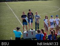 | Описание изображения: | Сборная БГУ стала «золотым» призером «Звездного матча Победы» В преддверии празднования 9 мая в БГУ состоялся «Звездный матч Победы». Открыл патриотическую спортивную акцию приветственным словом ректор БГУ Андрей Король. «Звездный матч» проходит в нашем вузе впервые. Он объединил звезд эстрады и звезд из числа профессорско-педагогического и студенческого состава БГУ. Сегодняшний матч посвящен Великой Победе, и я рассчитываю, что он станет символом памяти трагических событий тех лет», – отметил ректор БГУ Андрей Король. Кроме того, руководитель ведущего вуза Беларуси был удостоен права первого удара по мячу и дал отсчет первому тайму. Футбольный поединок развернулся между сборными БГУ и артистов белорусской эстрады, театра и кино «Арт-Старс». В напряженной борьбе победу со счетом «2:1» одержала команда БГУ. Кроме того, в перерыве между первым и вторым таймом состоялся «Забег Победы». В дистанции на 500 метров среди представительниц БГУ в возрастной категории до 35 лет первого места удостоена преподаватель кафедры физического воспитания и спорта Екатерина Осипчик, на втором месте лаборант первой категории кафедры аналитической химии химического факультета Елена Добринец, на третьем – лаборант первой категории кафедры источниковедения исторического факультета Екатерина Смолякова. В возрастной категории от 36 до 50 лет первой финишировала заместитель декана по учебно-воспитательной работе ФФСН Вероника Сайганова, второй пришла преподаватель юридического колледжа БГУ Марина Кузьмар, третьей – доцент кафедры английского языка экономических специальностей ФМО Ольга Шиманская. В категории от 51 года до 60 лет золотой медали удостоена старший преподаватель кафедры романских языков ФМО Татьяна Шарупич, серебряная медаль у старшего преподавателя этой же кафедры Ольги Литвиненко, а бронзу завоевала заведующая кафедрой дизайна ФСК Ольга Воробьева. В возрастной категории от 61 года победила доцент кафедры экологии человека ФСК Надежда Телюк. Второго места здесь удостоена заведующая этой же кафедры Ирина Пантюк. В группе студентов первой к финишу пришла второкурсница юридического факультета Екатерина Осадчая, второго места удостоена четверокурсница ММФ Марина Герасимович, третьего – второкурсница юридического факультета Анастасия Осадчая. В мужском забеге на 1000 метров в возрастной категории до 35 метров золотой медали удостоен старший преподаватель кафедры теории и истории государства и права юридического факультета Виталий Вечерко, серебро завоевал сотрудник юридического колледжа БГУ Андрей Поспелов, а бронзу – доцент кафедры географической экологии географического факультета Дмитрий Воробьев. В категории от 36 до 50 лет на первом месте старший преподаватель кафедры аналитической химии химического факультета Александр Петров. Второго места удостоен преподаватель юридического колледжа БГУ Вадим Самсоник. Среди студентов золото завоевал третьекурсник юридического факультета Тимофей Тарасевич, серебро у третьекурсника ФПМИ Ивана Баженова, бронзы удостоен первокурсник филологического факультета Евгений Дорожко. Завершилась акция награждением победителей и концертом звезд белорусской эстрады, театра и кино «Арт-Старс». Организаторами мероприятия выступили Первичная профсоюзная 