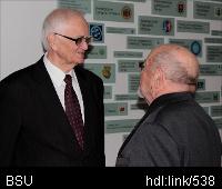 Описание изображения: | Двухдневная Международная научная конференция «Философско-культурологические идеи академика В.С. Стёпина в свете современных социальных трансформаций» состоялась 4-5 ноября в БГУ. В торжественной церемонии открытия приняли участие Председатель Совета Республики Национального собрания Беларуси академик Анатолий Рубинов, ректор БГУ академик Сергей Абламейко, директор Института философии РАН академик Абдусалам Гусейнов, деканы факультетов философского и психологии МГУ им. М.В. Ломоносова Владимир Миронов и Юрий Зинченко соответственно, главный редактор журнала «Вопросы философии» Борис Пружинин, зав. сектором Института философии РАН академик Владислав Лекторский, а также ученые БГУ, Республиканского института высшей школы БГУ, БГТУ и БГЭУ. В рамках научного форума состоялось чествование академика РАН Вячеслава Стёпина в связи с его 80-летием. Выдающийся ученый был награжден Почетной грамотой Национального собрания Беларуси. Член-корреспондент НАН Беларуси Александр Данилов выступил с докладом о вкладе академика Стёпина в исследование проблем методологии науки, теории познания, философии и культуры. Продолжилась работа научного форума 5 ноября заседанием круглого стола на тему «Социально-гуманитарная рефлексия проблем трансформации современного общества, культуры, науки и образования». В обсуждениях приняли участие ученые-философы России и Беларуси. В этот же день прошла презентация книги «Синтез философии, науки, культуры. К 80-летию академика В.С. Стёпина». Книга посвящена научной деятельности выдающегося современного философа, почетного профессора БГУ, академика Российской академии наук В.С. Стёпина, автора фундаментальных работ в области философии и методологии науки, социальной философии, философии культуры и культурологии. Представлены статьи юбиляра, белорусских ученых, освещающие широкий круг актуальных проблем научного познания, развития цивилизации и культуры, связанные с творчеством В.С. Стёпина. Имя Вячеслава Семеновича Степина хорошо известно и признано в мире. И хотя сегодня основное место его работы – Российская академия наук, он много сделал и делает для развития белорусской науки и образования, расширения сотрудничества между Россией и Беларусью. Вячеслав Семенович и сегодня активно сотрудничает с НАН Беларуси, БГУ и другими вузами страны, выступает на научных форумах в поддержку интеграционного процесса Беларуси и России, активно защищает интересы Беларуси в России, ближнем и дальнем зарубежье. В ходе конференции был подписан договор о сотрудничестве между БГУ и Институтом философии Российской академии наук, а также соглашение о взаимодействии между факультетом философии и социальных наук БГУ и факультетами философии и психологии МГУ им. М. Ломоносова. |