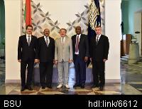 | Описание изображения: | Делегация правительства провинции Фри Стейт Южно-Африканской Республики посетила БГУ. В ее состав вошли глава департамента сельского хозяйства и сельской местности Тусо Рамаэма, первый секретарь отделения Посольства ЮАР в Беларуси Роберто Гомес и директор отдела международных отношений офиса премьера Мозес Кау. БГУ представили проректор по учебной работе и интернационализации образования Сергей Ходин, проректор по научной работе Василий Сафонов, начальник Главного управления науки Виталий Кутавичюс и заместитель начальника управления международных связей Роман Новиков. Визит в ведущий вуз страны состоялся с целью обсуждения вопросов международного сотрудничества и определения возможных направлений совместной деятельности. В частности, иностранных гостей интересовали отрасли, связанные с биотехнологиями, экологией, зеленой химией, сельским хозяйством. Особое внимание было уделено магистерским и аспирантским программам, по которым в БГУ обучаются иностранные граждане. В ближайшее время стороны подготовят детальную информацию по взаимовыгодному сотрудничеству в области образования и науки. Отметим, в этом году студентка из ЮАР стала выпускницей физического факультета БГУ. Диплом она получила по специальности «ядерная физика». |