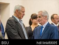 Описание изображения: | Выставка художественных голограмм «Клады земли белорусской» открылась в БГУ. В экспозицию вошли уникальные голографические изображения 3D-формата, представленные научно-производственной компанией «Магия света». В их числе: «Крест Ефросиньи Полоцкой», «Герб Республики Беларусь», ««Книга Царств» Ф. Скорины 1518 г.», «Пояс Витовта». В коллекцию выставки вошла также голограмма первой птицы, которая сочетала в себе признаки птиц и пресмыкающихся (динозавров). Ее облик воссоздан сотрудниками Зоологического музея БГУ, где и хранится до настоящего времени. Кроме того, посетители увидят голограммы зуба 20-летнего мамонта, уникальной пишущей машинки – прообраза современных принтеров, на которой печатались рукописи, диссертации. Отметим, на такой машинке выполнялось делопроизводство кафедры лазерной физики и спектроскопии физического факультета БГУ до появления персональных компьютеров. Экспозиция продлится до 14 октября включительно. Посетить выставку могут все желающие студенты и сотрудники БГУ. Организатором выставки выступил физический факультет БГУ и проводится она в рамках юбилейных мероприятий, приуроченных к празднованию 60-летия физического факультета. |