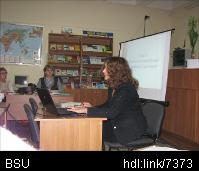 | Описание изображения: | Яркими, значимыми мероприятиями конференции стали мастер-классы ведущих специалистов в области формирования информационной культуры личности. 13 октября Наталья Ивановна Гендина, доктор педагогических наук, профессор, директор Научно-исследовательского института информационных технологий социальной сферы Кемеровского государственного университета культуры и искусств провела мастер-класс «Учебный курс «Основы информационной культуры личности» в вузовской библиотеке: концептуальные основы и методика проведения занятий». Наталья Ивановна подарила электронный вариант авторского учебно-методического пособия «Основы информационной культуры личности», которое используется сотрудниками библиотек вузов РБ. |