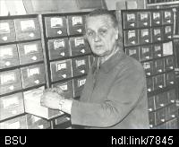 | Описание изображения: | Библиотекарь справочно-библиографического отдела Рудаковская Валентина Евгеньевна осуществляет поиск литературы в карточном каталоге библиотеки |