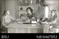 | Описание изображения: | Отдел комплектования. В центре сидит заведующий отделом комплектования Зрубович Л.И., рядом с ней стоит Лагойская Т.А. |