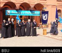 | Описание изображения: | День знаний – 1 сентября – в БГУ встретили 6386 первокурсников. Это один из лучших наборов за всю историю Белорусского государственного университета и знаменательно, что произошло это в год 90-летия вуза. Самые успешные юноши и девушки по традиции были приглашены в этот день на встречу с ректором академиком Сергеем Абламейко и представителями ректората. Она прошла во внутреннем дворике университета. В честь Дня знаний и начала нового учебного года в БГУ в Минском Свято-Духовом кафедральном соборе в 12.00 состоялся молебен, который отслужил Митрополит Минский и Слуцкий Филарет, Патриарший Экзарх всея Беларуси, а также ректор Института теологии имени св. Мефодия и Кирилла БГУ. Продолжился праздник в столичном Дворце спорта театрализованной шоу-программой «Виват, студент!». Начало в 17.30. Торжественную часть открыло шествие деканов с внесением штандаров всех факультетов БГУ. С напутствием к юношам и девушкам обратился ректор академик Сергей Абламейко. В свою очередь, первокурсники дали клятву «высоко нести, хранить и умножать славные традиции БГУ, во всем быть образцом честности, благородства, трудолюбия и дисциплины, активно участвовать в общественной, научной и культурной жизни alma-mater, всю силу ума, весь жар своего сердца направить на повышение авторитета отечественной науки и образования, с честью носить гордое звание студента, быть достойными гражданами Республики Беларусь». Торжество продолжилось концертом звезд белорусской эстрады, а завершающим аккордом программы стала дискотека с конкурсами и призами. |
