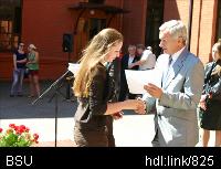 Описание изображения: День памяти студентов, преподавателей и сотрудников Белорусского государственного университета, героически сражавшихся на полях Великой Отечественной войны и отдавших свои жизни за освобождение и независимость Беларуси, прошел в БГУ 29 июня. Участие в мероприятиях приняли ректор БГУ академик НАН Беларуси Сергей Абламейко, члены Минской городской организации ветеранов, совета ветеранов БГУ, сотрудники и студенты вуза. Состоялся митинг-реквием у здания ректората, награждение призеров викторины среди студентов и аспирантов БГУ, посвященной 65-летию освобождения Беларуси от немецко-фашистских захватчиков, возложение цветов к Стеле памяти во внутреннем дворике университета.