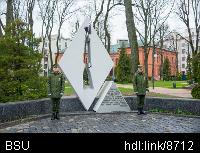 Описание изображения: Акция, посвященная Победе советского народа над немецко-фашистскими захватчиками, состоялась 25 апреля у мемориального знака «Стела памяти» во внутреннем дворике вуза. В этот день студенты и сотрудники БГУ во главе с ректором Андреем Королем в знак уважения к подвигу предков возложили цветы к памятнику и отдали дань памяти скорбной минутой молчания. Также в почетный караул у вузовского мемориала «Стела памяти» заступили курсанты военного факультета БГУ. В течение 15 дней до Дня Победы они будут нести Вахту Памяти. Напомним, во внутреннем дворике вуза рядом с памятником размещена табличка с QR-кодом онлайн-мемориала «Память во имя живых» с информацией о героях военных лет. Все желающие могут через эту технологию узнать сведения о 67 погибших в годы войны сотрудниках и студентах БГУ. Всего в 1941 году в вузе училось 1400 человек, работал 151 научный сотрудник, 210 человек административно-технического персонала и 90 учебно-вспомогательного. Таким образом, общее количество составило 1851 человек. Только в первые дни войны около 450 студентов и преподавателей добровольцами ушли на фронт. Эвакуироваться успели только 620 человек. В городе остались преподаватели и студенты, большинство из которых стали активными участниками подпольного и партизанского движения. Из числа студентов и сотрудников БГУ – участников событий тех лет, 12 присвоено звание Героев Советского Союза.