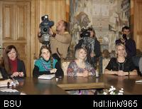 Описание изображения: В рамках празднования юбилея БГУ 26 октября состоялась встреча ректора БГУ Сергея Абламейко с представителями 20 республиканских СМИ. Журналисты за широкое и обстоятельное освещение деятельности БГУ были награждены дипломами и подарками.